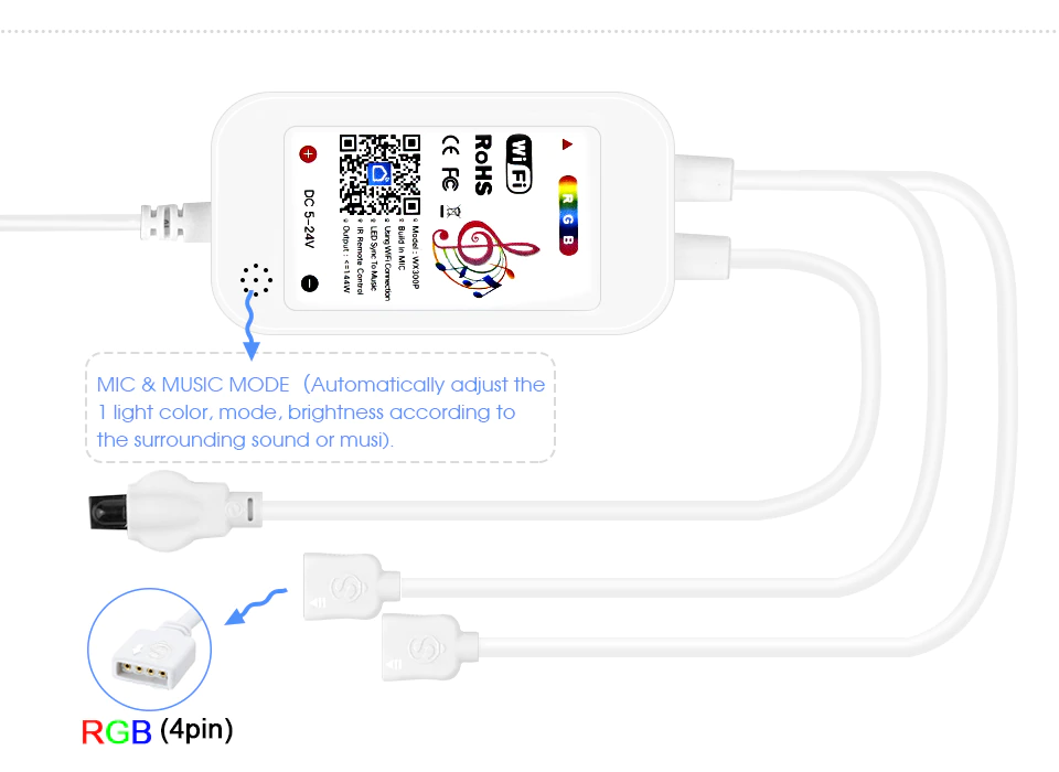 Tym razem zakup z Chin, na szczęście obyło się bez cła. Produkt znalazłem pod hasłem "Tuya WiFi Smart RGB LED Strip Controller 4Pin 5-24V APP Control Work With Alexa", choć można szukać też po nazwie modelu. 4Pin oznacza oczywiście 4 przewody, RGB i masa.
