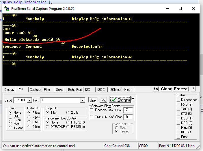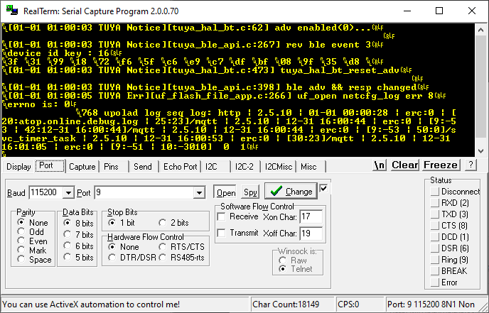 Na padzie TX można posłuchać co się dzieje z urządzeniem - baud 115200.