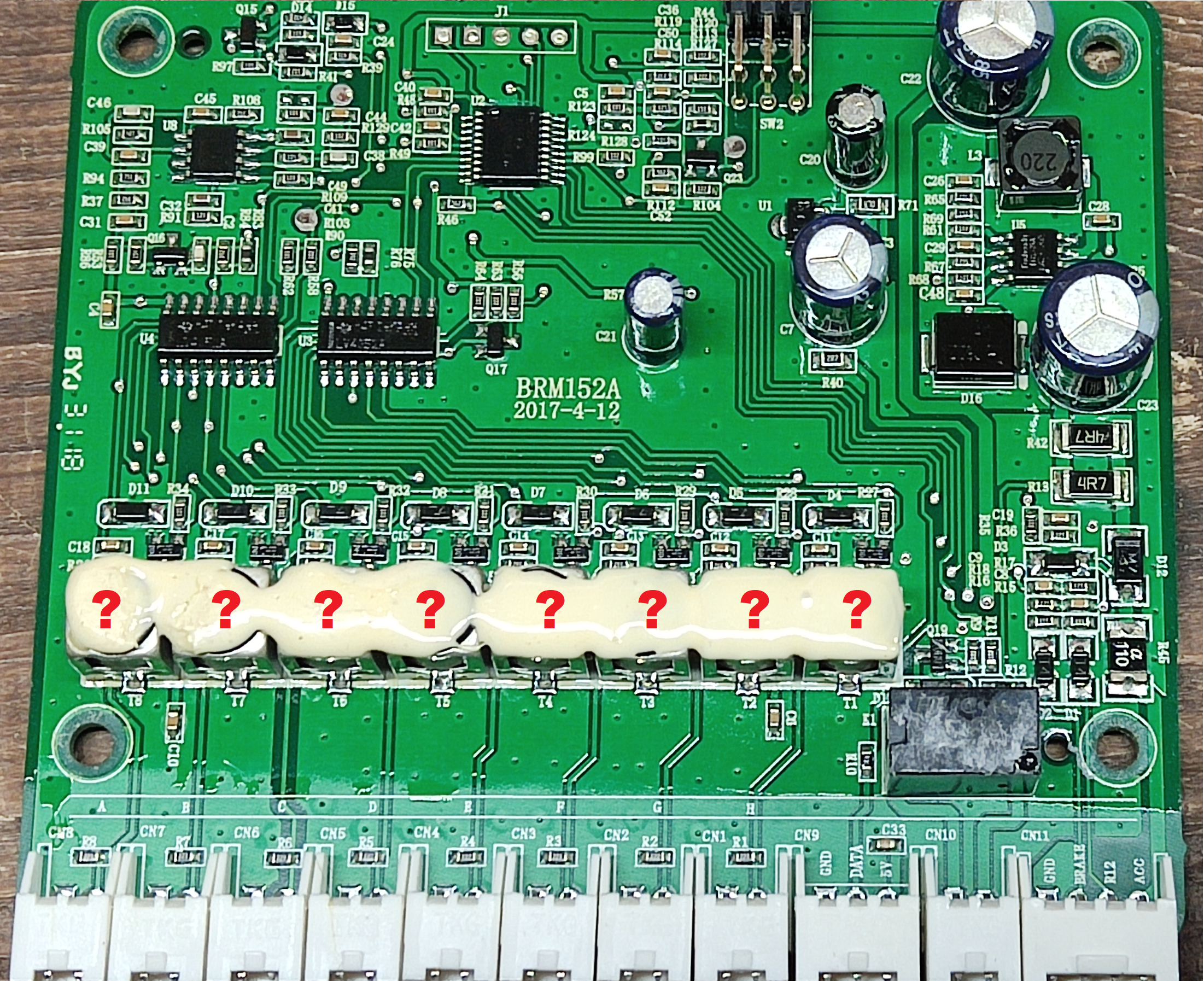 Poniżej zdjęcie centralki... Może przyda się do rozwiązania problemu? Może pod tym lakiem czy klejem (jest miękki i elastyczny), da się coś wyregulować, tak aby czujniki nie widziały przeszkody (orurowania) np. po przez zakres jego działa do kilku cm? Od czego to w ogóle jest właśnie w tej centralce przypisane pod każdy czujnik?