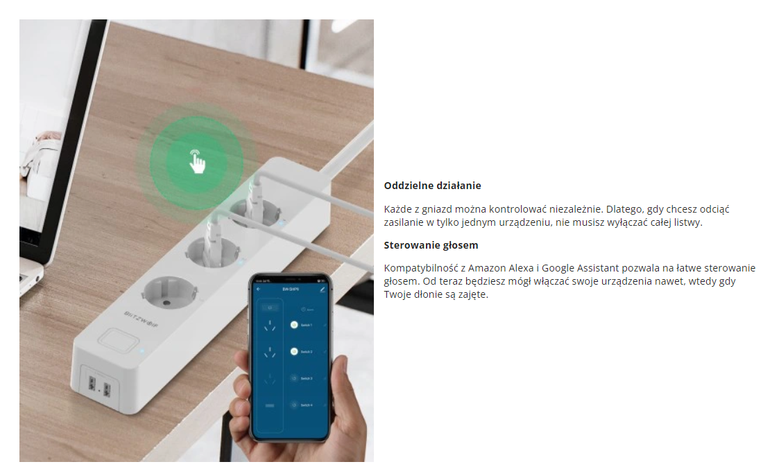Każde z trzech gniazd sieciowych jest sterowane osobno. Gniazda USB oba sterowane są razem (jako czwarty kanał). Wydajność portów USB to łącznie 2.4A.
