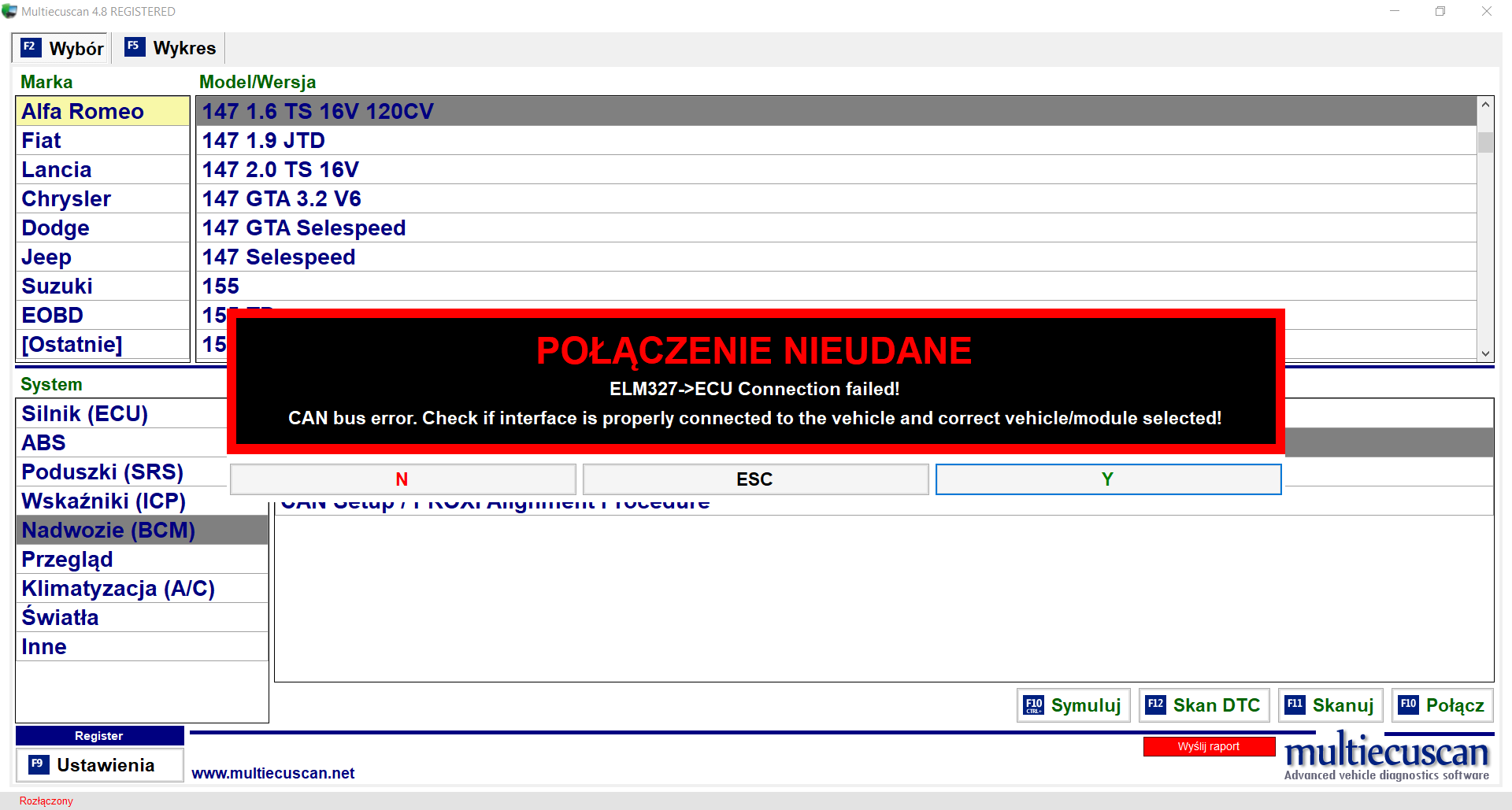 Cześć. Jako że w swojej okolicy nie mam ogarniętego elektryka który pomógł by z moim problemem to zwracam się do was z moim problemem. Posiadam Alfe 147 1.6 i mam orginalny program Multiecuscan wraz z kablem elm327 przerobionym bezpośrednio przez sprzedawcę pod mes'a i problem polega na tym że nie mogę się połączyć z CAN. Po podłączeniu błędy mogę skasować ale nic po za tym. Według sprzedawcy po wymianie kilkudziesięciu maili sam kabel powinien działać bez zarzutów. Za każdym razem jak próbuje łączyć się z CAN wyskakuje błąd połączenia. Interfejs ma dobre sterowniki, wszystko z portami ustawione dobrze. Okazuje się że prawdopodobnie możliwe jest gdzieś zwarcie na szynie can. I teraz nasuwa się pytanie gdzie te zwarcie szukać.