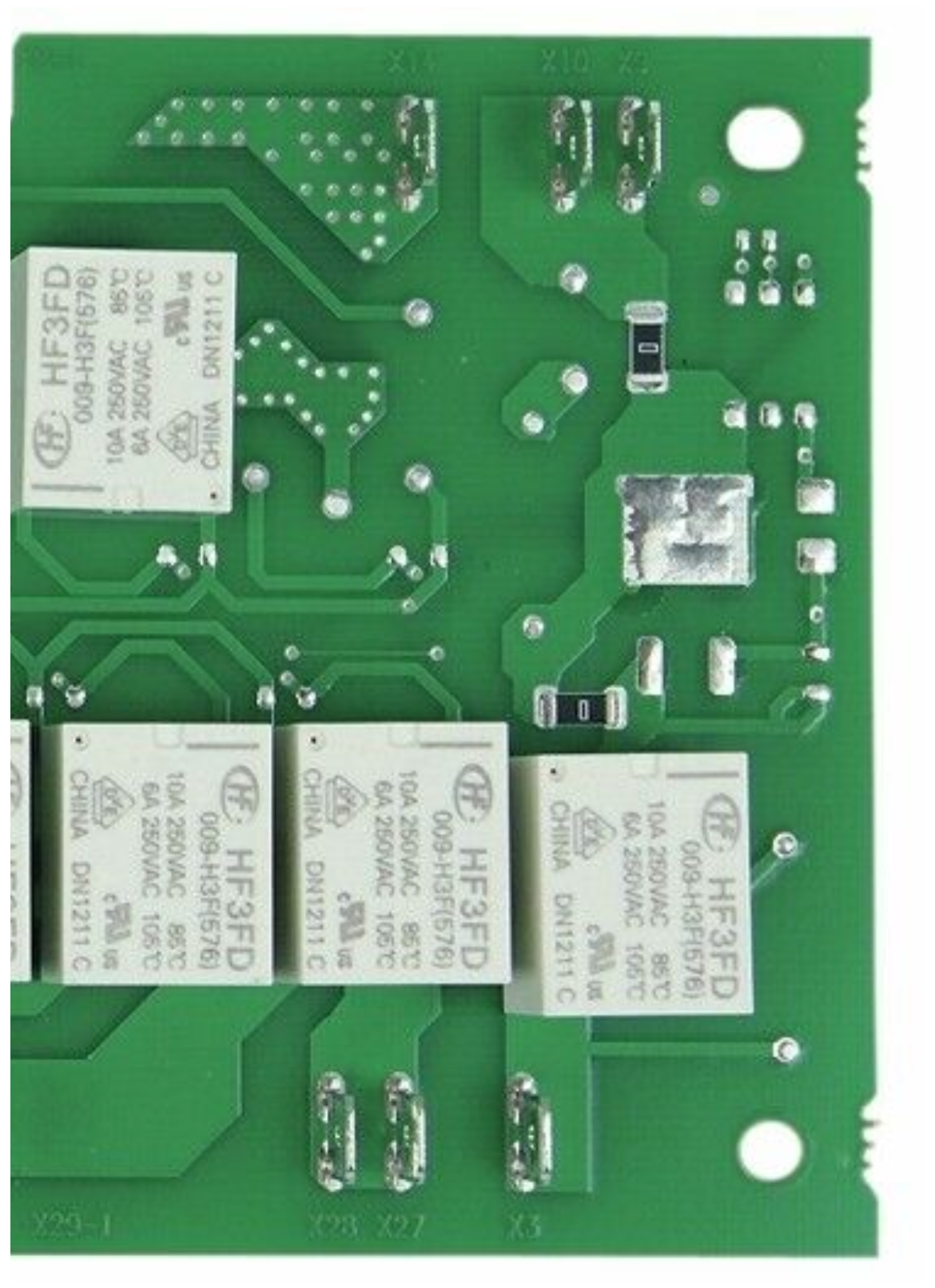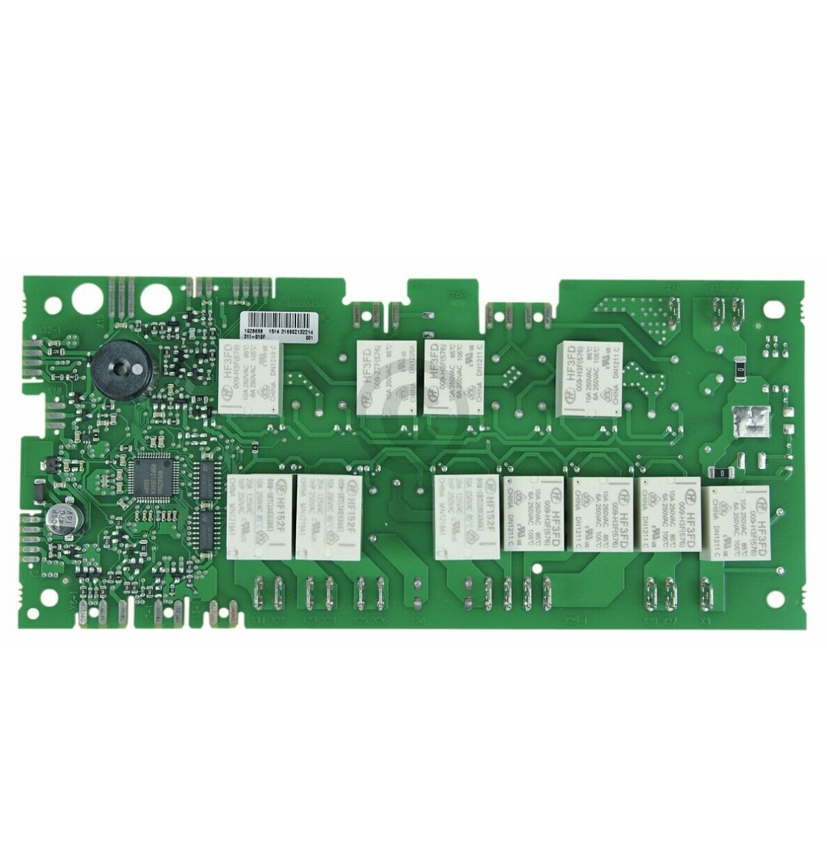 Po wymontowaniu piekarnika, odłączeniu od prądu i zdjęciu górnej pokrywy widzimy płytkę drukowaną, na której po prawej mamy widoczną czarną kostkę układu scalonego i elektronikę SMD. Od lewej (patrząc od frontu) na płytce jest rząd białych przekaźników. W oczy rzuca się, że pierwszy od lewej jest osmolony, a element na płytce obok niego jest spalony.