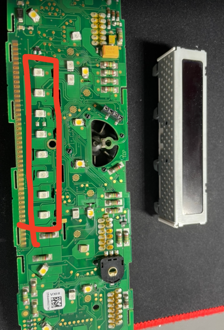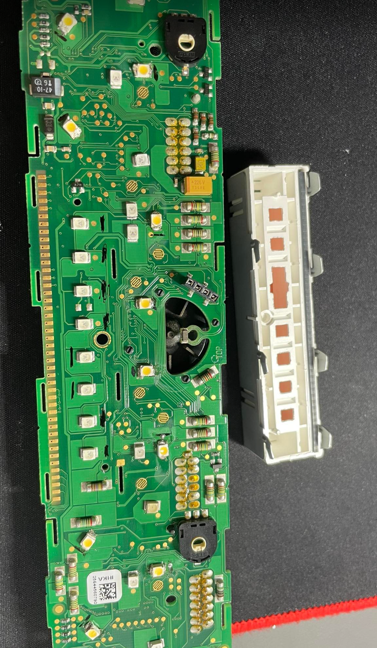 Po otwarciu panelu klimy oraz zdjęciu ekraniku znalazłem 8x dioda 3528 led. Zamieniłem je na takie same 3528 led ale na kolor zimny biały. Jednak ekran panelu klimatyzacji został nadal w kolorze standardowym, pomarańczowym.