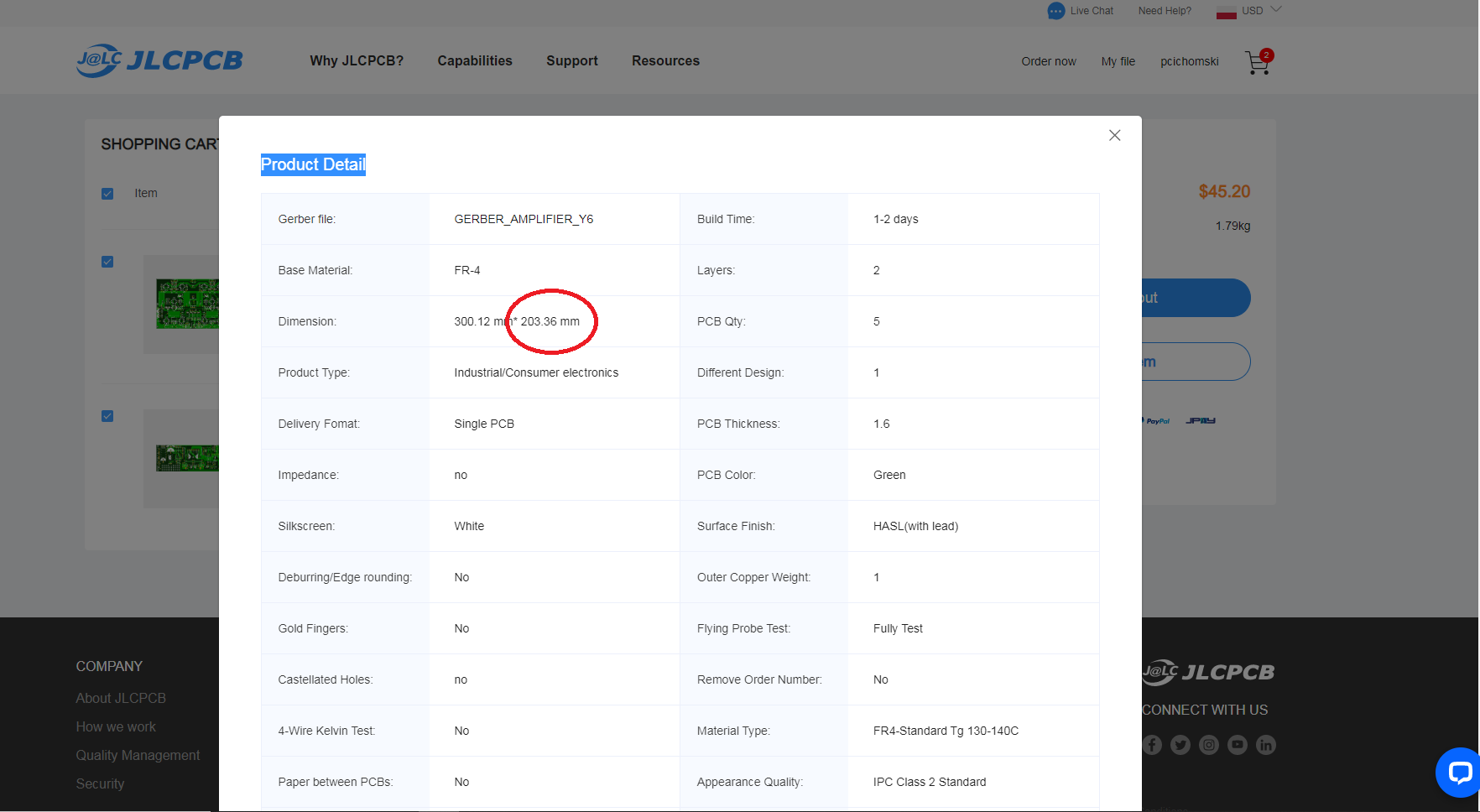 Dodam jeszcze, że kiedyś robiłem już projekt takiej dość dużej płytki (300x150) w Kicad`zie i zamawiałem u tego samego dostawcy. Testowo zaczytałem ponownie tamte pliki GERBER do formularza zamówienia i w tym przypadku wszystko się zgadza – JLCPCB.com określił wymiary płytki prawidłowo (300x150).