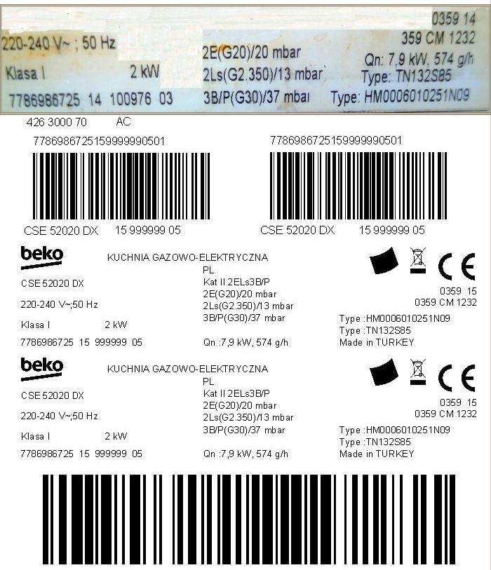 Rodzice mają taką kuchenkę gazowo-elektryczna Beko ale niestety nie znam jej modelu. Jedyne informacje jakie znalazłem to te na załączonym zdjęciu. Mają ostatnio problem z piekarnikiem, który jest elektryczny i przestał grzać
