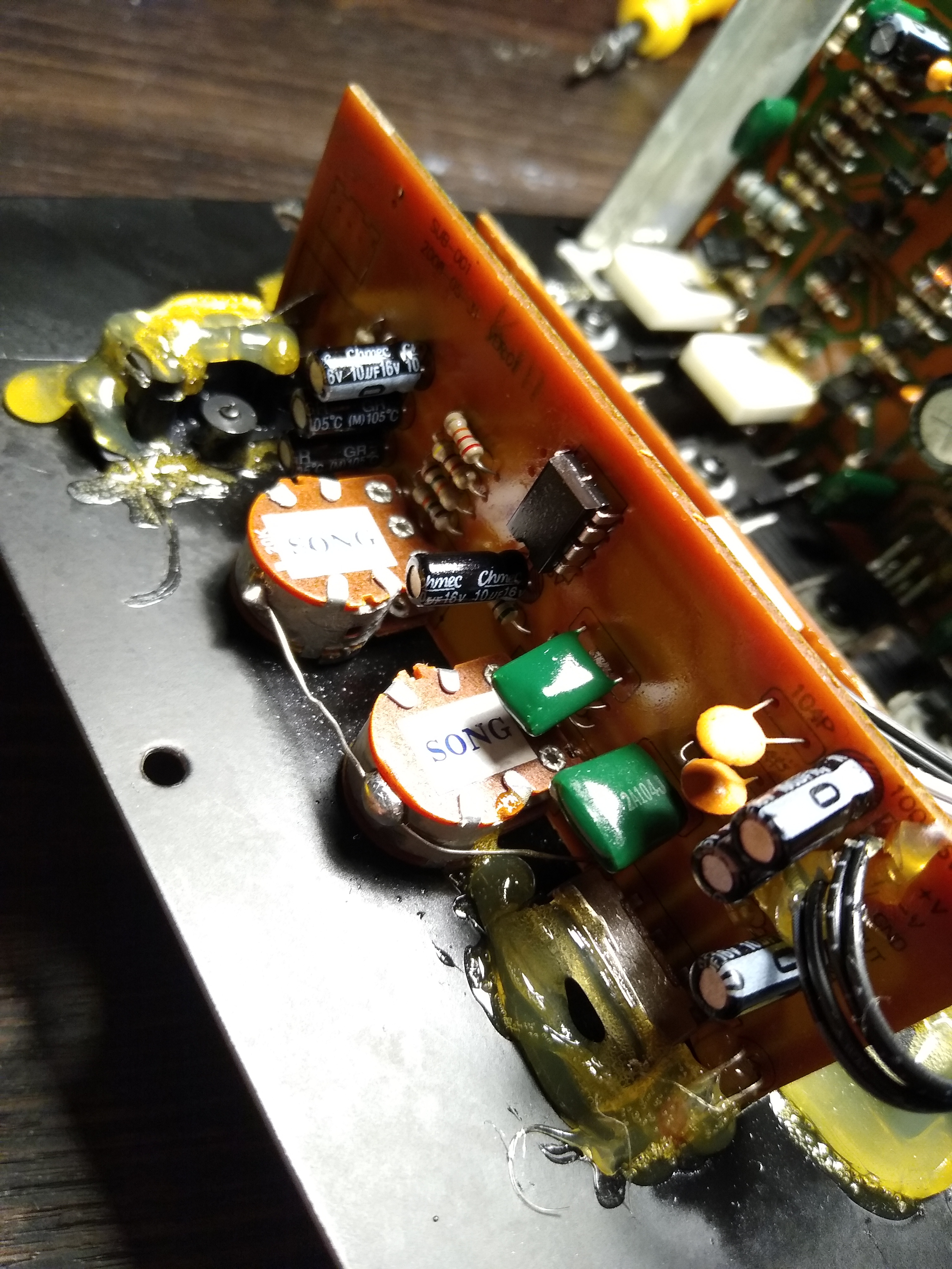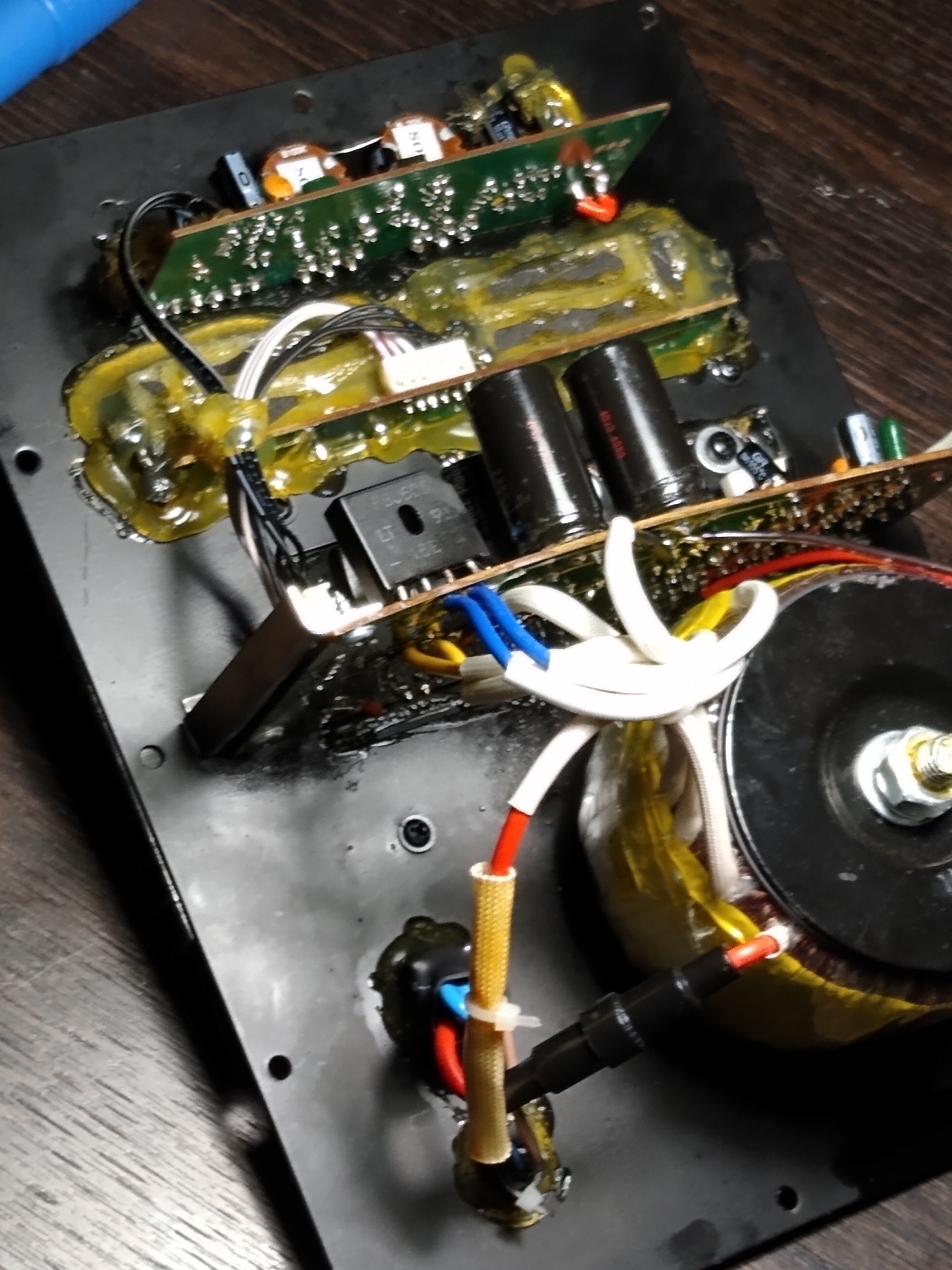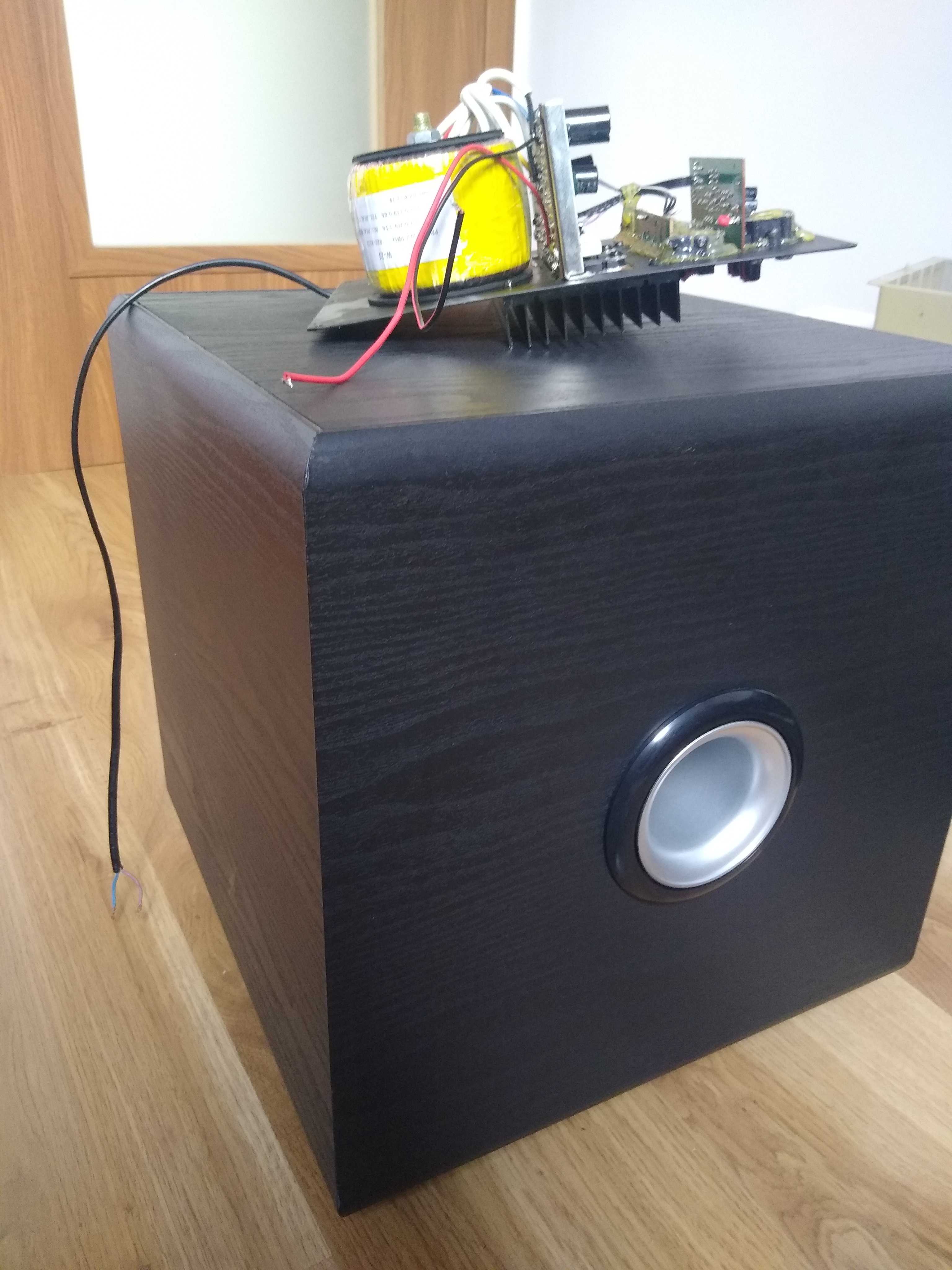 Jestem w trakcie próby ustalenia przyczyny brumienia, buczenia w subwooferze Tuono B25. Jest to jakaś niemasowa niemiecka produkcja. Wykonanie płytek i połączeń bardzo ubogie. Po włączeniu zasilania przełącznikiem "Power" pojawia się "buczenie" widoczne na oscyloskopie w załączonym filmie. Co ciekawe amplituda buczenia jest większa przy pozycji "OFF" drugiego przełącznika, aniżeli w pozycji "ON". Sprawdziłem wszystkie elektrolity w zasilaniu, mostki prostownicze na wyjściu z trafo również są sprawne. Jak widać na załączonym filmie amplituda zakłucenia zmienia się gdy kręcę potencjometrem "FREQUENCY", nie zmienia się natomiast nic, gdy kręcę potencjometrem "VOLUME". Czy ma ktoś doświadczenie z podobnym przypadkiem?