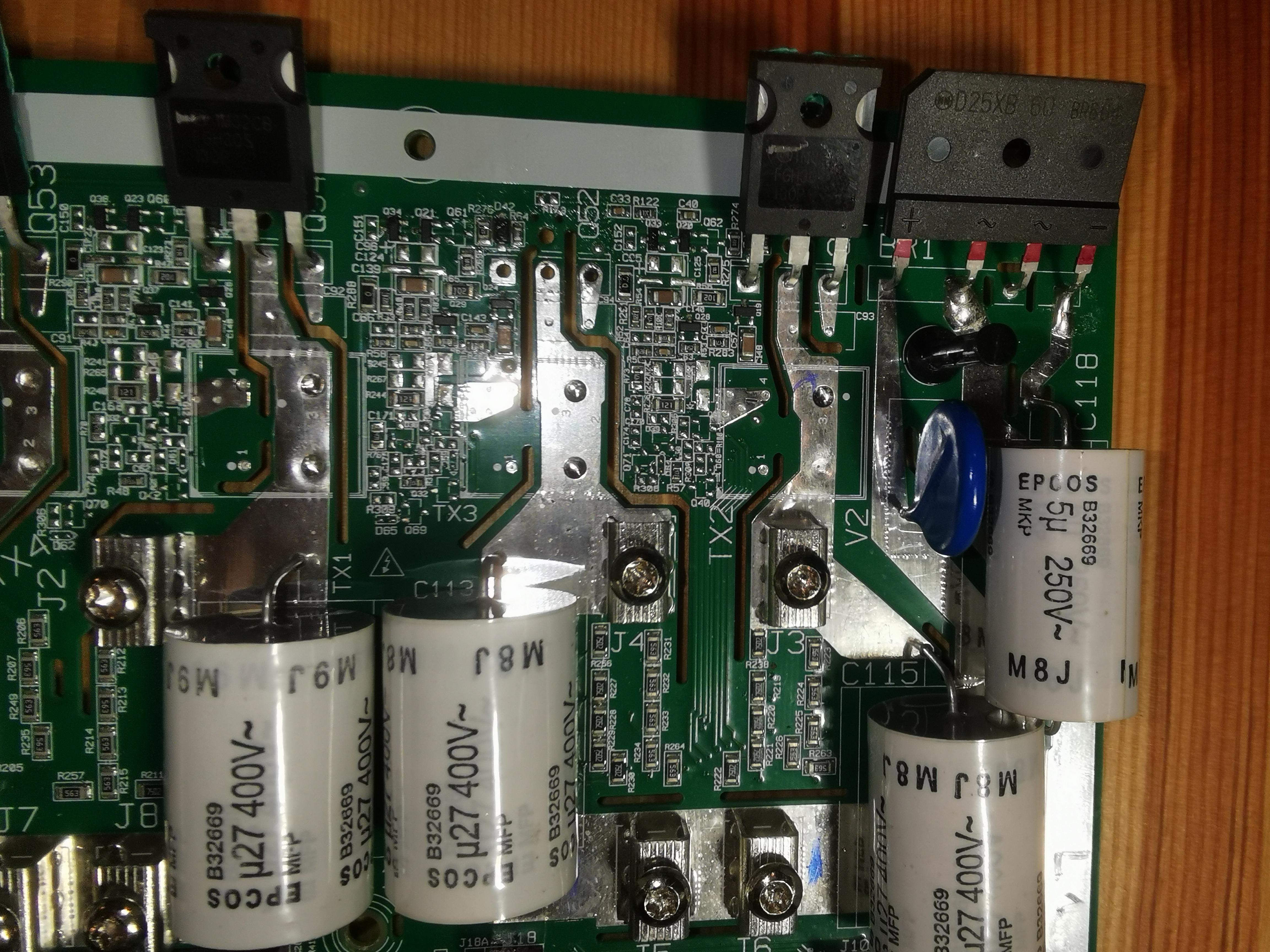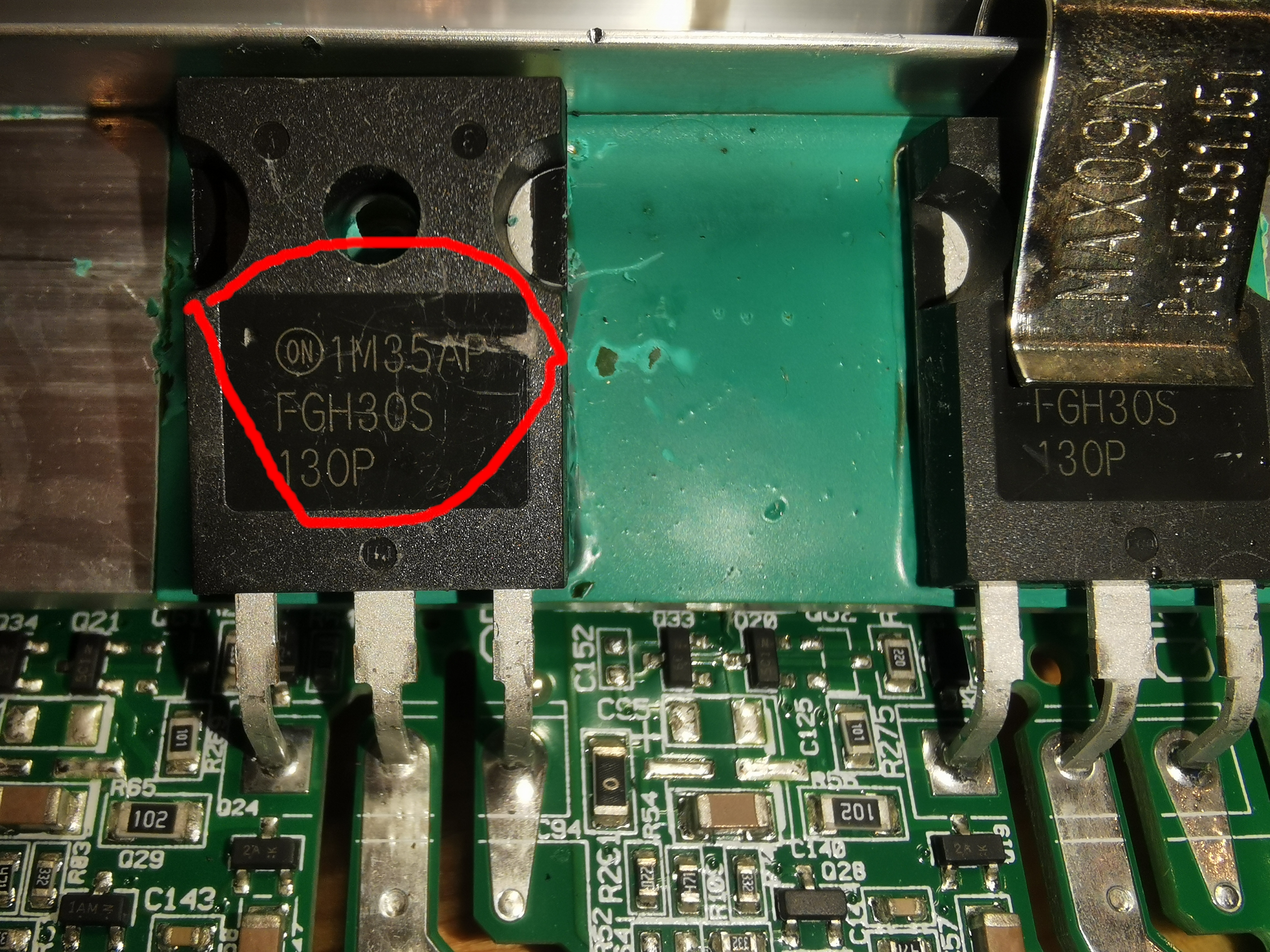 Mam problem z płytą indukcyjną Whirlpool ACM932BF (zabezpieczenie trójfazowe B20 zaczęło wyłączać). Po usunięciu tranzystora IGBT FGH30S130P przeciążenie ustąpiło (zaznaczony na zdjęciach). Płyta indukcyjna uruchamia się, pracuje poprawnie oprócz pola, w które ingerowałem. Drobne elementy SMD sprawdzone i porównane "testem diody" z pozostałymi sekcjami. Czy jest potrzeba wymienić jeszcze inne elementy oprócz tranzystora?