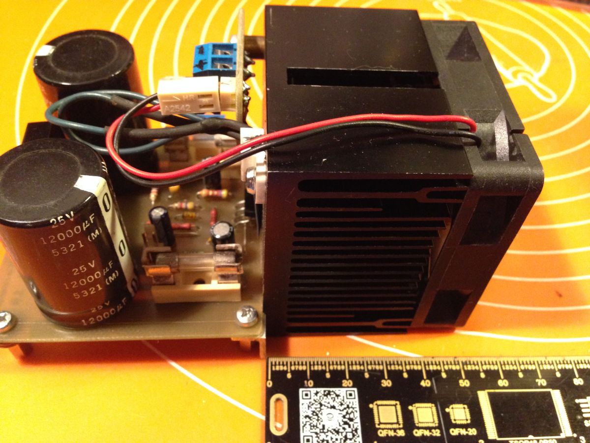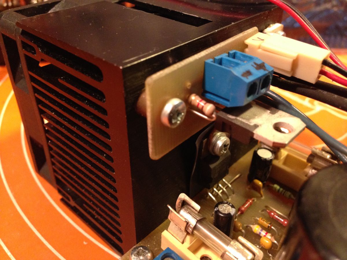 Powyżej prosty układ zasilacza z regulacją napięcia i prądu stosunkowo niewielkiej mocy. Do takich zadań taki radiator jest wręcz stworzony; dodatkowo sam propeller jest zasilany poprzez układ regulacji obrotów w zależności od temperatury - czujnik wkręcony w nagwintowany otwór M5. Zarówno obroty, jak i chłodzenie rośnie wraz ze wzrostem temperatury. W taki sposób jest też wykonana regulacja w innym egzemplarzu tego radiatora, wykorzystanego do chłodzenia wzmacniacza mojej wieży DiY - przy normalnym słuchaniu wentylator co najwyżej okresowo się załączy na minimalnych obrotach (jest wówczas całkowicie niesłyszalny), włącza się na większej mocy dopiero przy głośnym graniu (raptem 2x15W, więc maksymalnych obrotów nie osiąga nigdy) - tego zdjęcia nie załączam, gdyż trudno mi wysunąć całą wieżę z regału, by zrobić fotkę - przepraszam...