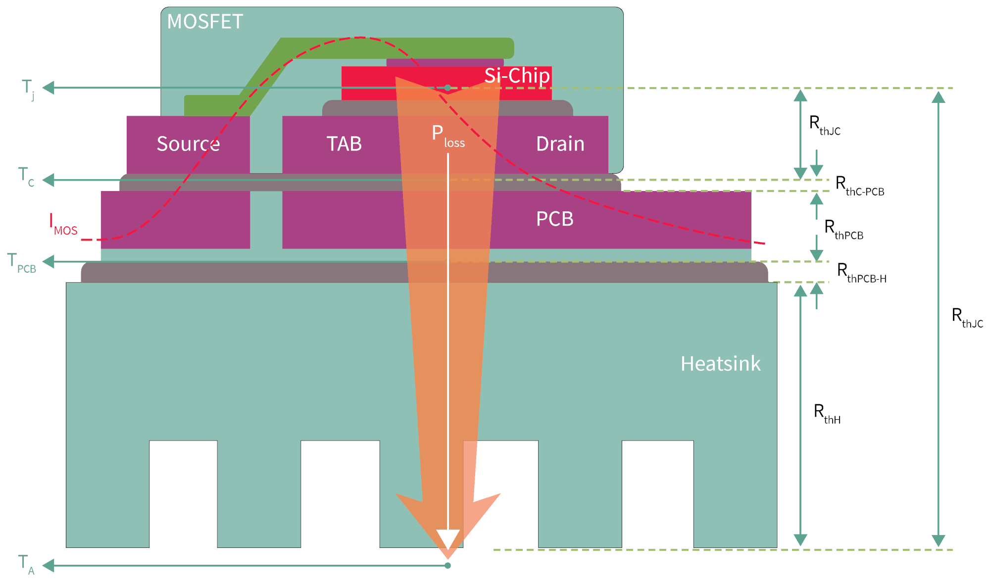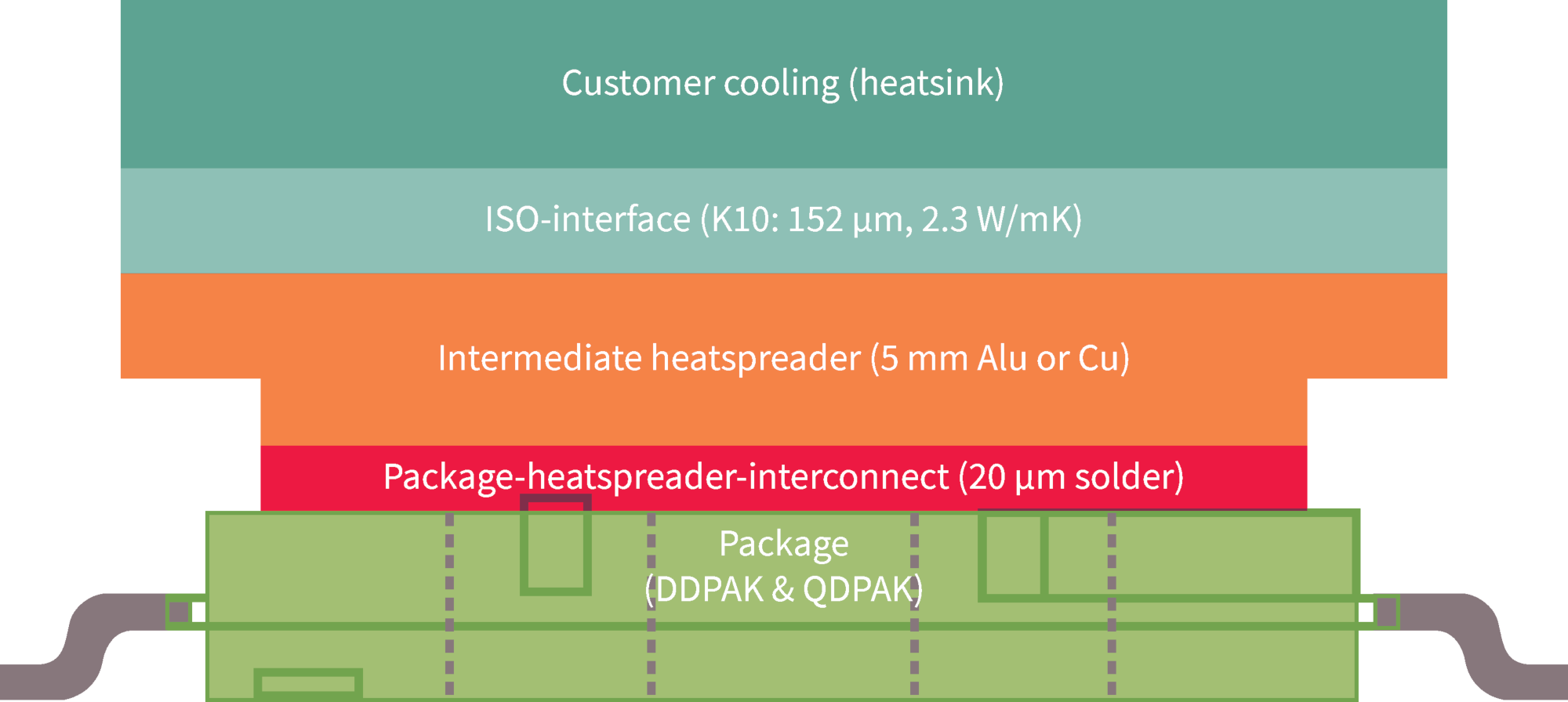 Rysunki 3 i 4 przedstawiają podstawową koncepcję chłodzenia BSC i TSC. W obu przypadkach obudowa SMD jest montowana na płytce drukowanej, zwykle w procesie lutowania rozpływowego. W przypadku BSC główny strumień ciepła jest kierowany z radiatora urządzenia (odsłoniętej podkładki) na spodzie obudowy przez płytkę drukowaną do zewnętrznego, zamontowanego po przeciwnej stronie PCB. W związku z tym, w przypadku korzystania z PCB opartego na FR4 do przenoszenia ciepła potrzebne są przelotki termiczne pod obudową. Z tyłu płytki, zewnętrzny radiator jest montowany na obszarze z przelotkami termicznymi. Radiator i PCB są elektrycznie oddzielone od siebie za pomocą materiału interfejsu termicznego (TIM). Dość często jako TIM stosuje się folię o grubości w zakresie 100–500 μm, która ma dobrą przewodność cieplną (λ). Idealnie prowadzi to do osiągnięcia niskiej impedancji termicznej (Zthja) dla całego systemu.