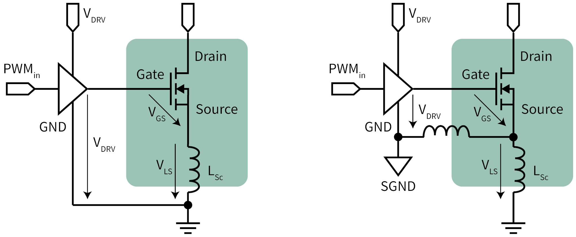 Omówiony powyżej negatywny wpływ LSc można wyeliminować za pomocą oddzielnego pinu czujnika źródła (źródło Kelvina) do sterowania bramką (rysunek 10, po prawej), co skutecznie zmniejsza straty przy przełączaniu. Wykorzystując połączenie czujnika i źródła do sterowania bramką, LSc wychodzi poza pętlę sterowania. Dlatego indukowane napięcia nie będą wracać do obwodu sterującego, jak miałoby to miejsce w standardowej konfiguracji (rysunek 10, po lewej) z tylko jednym połączeniem źródła z tranzystorem MOSFET.
