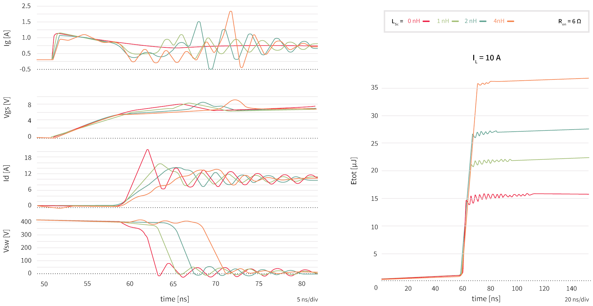 Rysunek 9 przedstawia wpływ indukcyjności źródła pakietu (LSc) na stan nieustalony włączania. LSc zwiększa się z 0 do 4 nH. Wzrost prądu drenu (di/dt) powoduje indukcyjny spadek napięcia na LSc, który odejmuje od napięcia sterującego bramką, a tym samym zmniejsza prąd bramki. Zatem przejściowe napięcie trwa dłużej, a straty rosną. Ten sam mechanizm, ale w odwrotny sposób, dotyczy stanu nieustalonego podczas wyłączania.