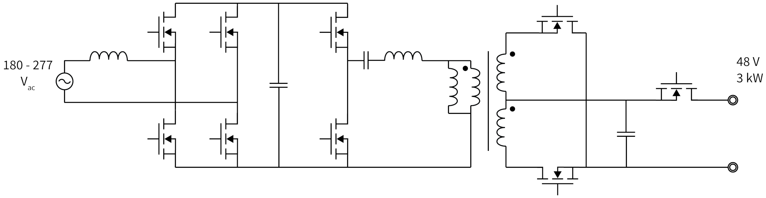 Zazwyczaj najnowocześniejsze zasilacze o wysokiej sprawności składają się z bezmostkowego stopnia PFC, takiego jak totem-pole, oraz rezonansowego stopnia DC/DC typu konwerter LLC (patrz rysunek 1). Przykładowa specyfikacja zasilania serwera to Vin = 180–277 V, Vout = 48 V, Pout = 3 kW.