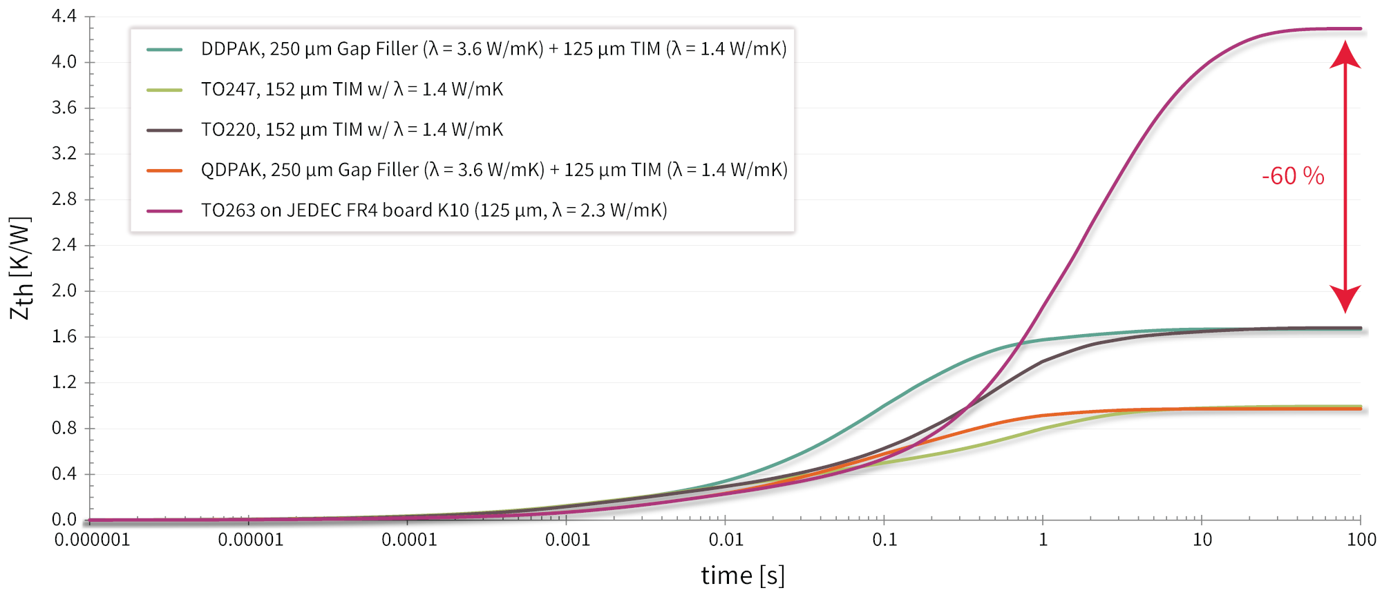 Legenda wykresu pokazuje, że użycie cienkich warstw materiałów izolacyjnych o porównywalnym, wysokim λ jest kluczem do osiągnięcia dobrych wyników w zakresie Zthja. Poza tym stosowanie wypełniacza szczelin i folii izolacyjnej o jeszcze wyższym λ doprowadzi do sytuacji, w której pokazane opakowania TSC będą dostarczać niższą Zthja niż elementy THT.