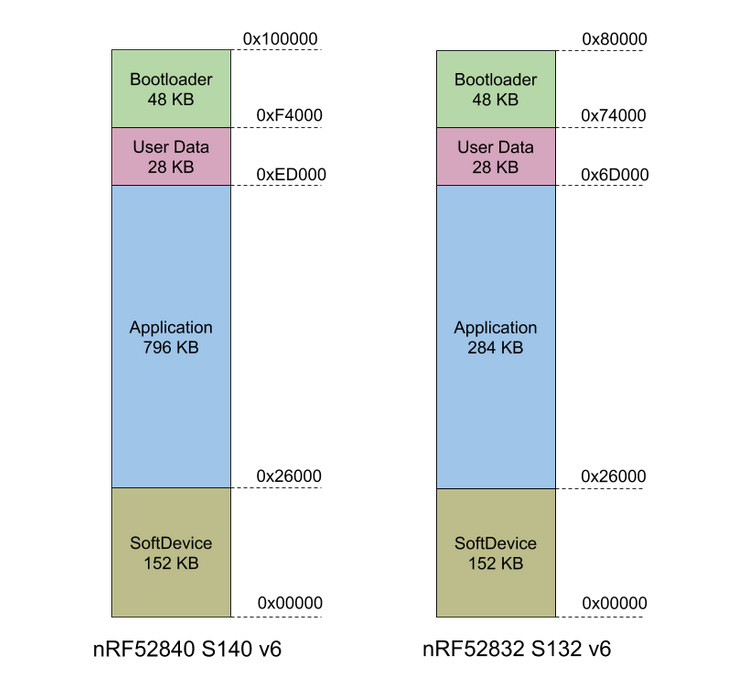 Pochyliłem się bardziej nad Adafruit bo na tym core chciałbym się skupić. Znalazłem w plikach tego repozytorium w ścieżce Arduino plik .hex który zawiera w sobie SoftDevice i Bootloader. Otwierając plik w edytorze HxD faktycznie widać, że zgodnie z mapą w zakresie 0x00000 do 0x26000 i 0x74000 - 0x80000 są jakieś dane - zapewne SoftDevice i Bootloader. Dodałem do tego pliku od adresu 0x26000 zawartość .bin wygenerowanego przez Arduino i wgrałem całość do procka. Dioda zaczęła migać, ale tylko przez chwilę, później kilka sekund przerwy i znowu zaczeła migać ale w losowych odstępach czasu, więc jest już lepiej ale nie do końca. Zauważyłem, że Arduino oprócz .bin generuje też plik .dat. Założyłem, że to mogą być dane oznaczone na mapie jako UserData. Dodałem więc i je od adresu 0x6D000, ale po wgraniu dioda zaczęła migać ale po chwili przestała i już nie chciała więcej migać. Czyli gorzej.