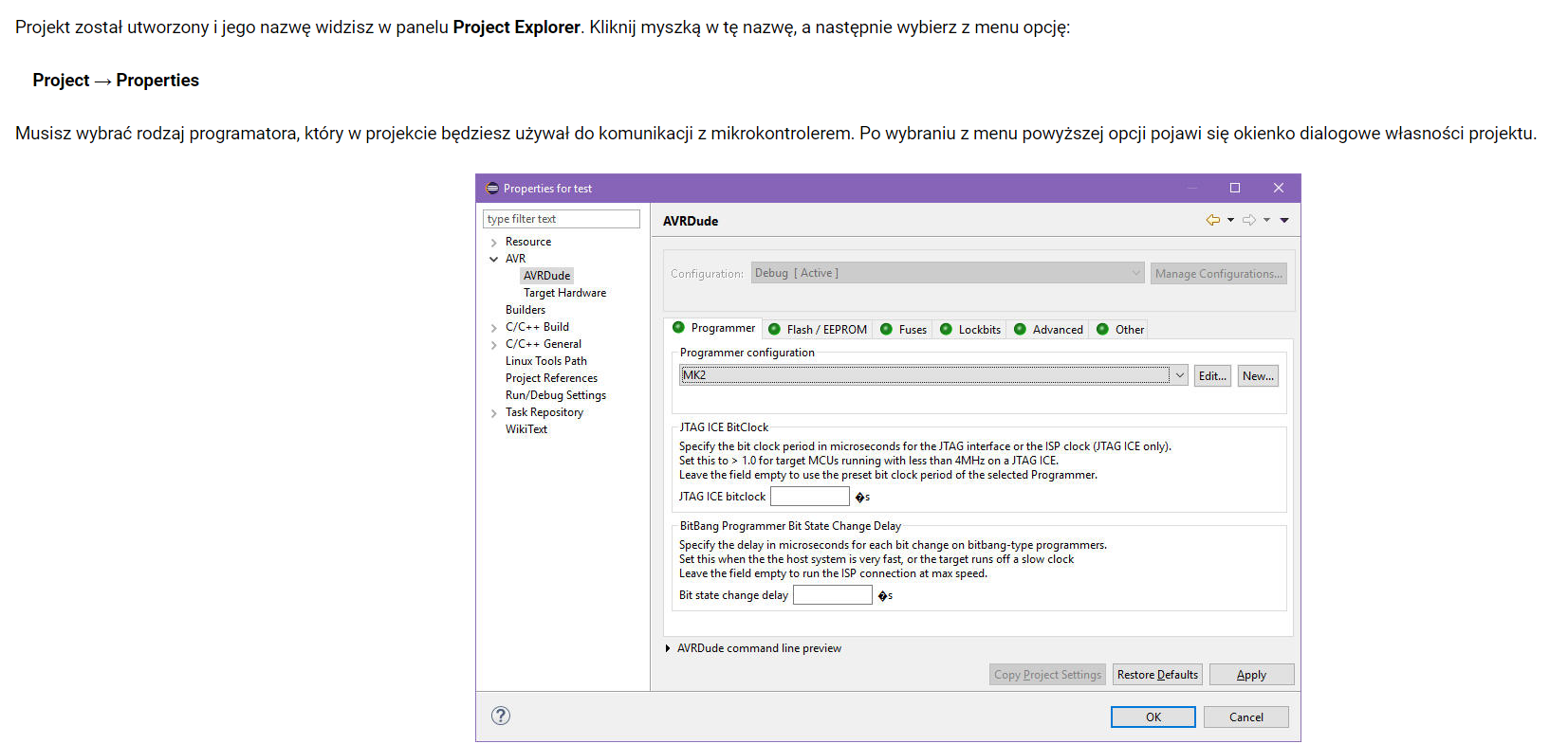 Wchodząc w: Project → Properties, nie mam w ogóle zakładki z AVR (tak jak jest pokazane wyżej), ominąłem ten krok, jednak po kliknięciu AVR i zielonej strzałki pokazuje "No AVR project selected".