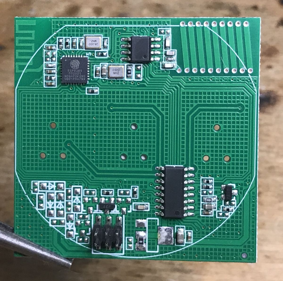 Mała dodatkowa uwaga - tutaj kontrola przez RF zrealizowana jest tak, że niedpopisany układ w SOIC8 odbiera sygnały ale ma tylko jeden pin wyjściowy, podłączony do układu w SOIC16. Ten SOIC16 z kolei odpowiedzialny jest za parowanie z RF (poprzez dłuższe wciśnięcie danego przycisku) oraz za odbiór RF i reagowanie na sygnały RF. Układ ten reaguje na naciśnięcie przycisku na pilocie RF w ten sposób, że po prostu "symuluje" wciśnięcie przycisku, tak jakby użytkownik wciskał przycisk dotykowy. Dlatego moduł WiFi "nie wie" kto wciska przycisk, czy użytkownik fizycznie, czy to sygnał RF. Z tego też powodu po zmianie firmware RF433 dalej działa.