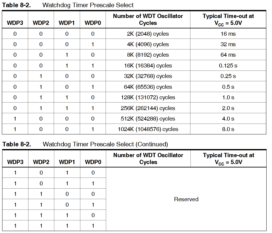 WDTCR |= (1<<WDP3 )|(0<<WDP2 )|(0<<WDP1)|(1<<WDP0); // 8s