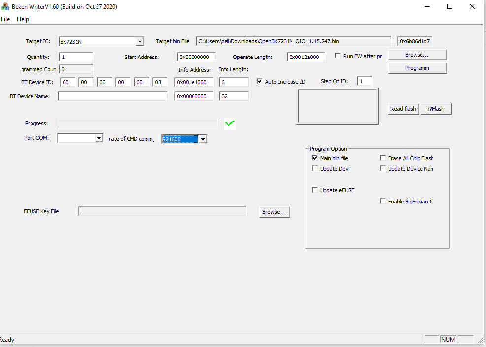 Ustawienia programu ustawionego na wgrywanie firmware bk_writer jak na obrazku poniżej: