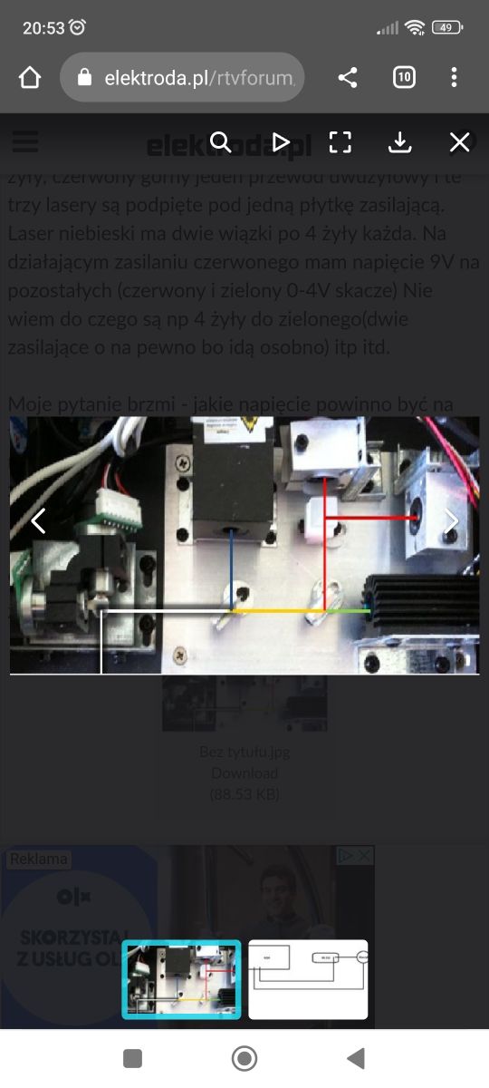Laser laserworld cs 1000 rgb jest to raczej 1 wydanie nie mk2 ani 3. Laser przeleżał kilka lat nie używany w pokrowcu. Po podłączeniu i uruchomieniu pojawił się problem . Wszystkie lasery świecą, działa tryb auto i na mikrofon .Jest jednak problem z jednym "silniczkiem krokowym"(tak to się chyba fachowo nazywa) co zakończony jest tym małym lusterkiem co odbija wiązkę laserów . Dolny chodzi a górny nic nie reaguje. I teraz pytanie co mogło się stac ? Istnieje możliwość że poprostu silniczek przestał działać ? Czy raczej coś na płytce ? Idzie go jakoś sprawdzić? Oba silniczki wygląda identycznie i podłączone są do nich identyczne przewody . Może zamiana przewodów tzn z tego co działa odpiąć przewód i wpiąć ten silniczek co nie działa to dobry pomysł czy nie bardzo? Może ktoś się orientuje czy da się taki silniczek kupić nowy i gdzie szukać albo pod jaka nazwa bo żadnych oznaczeń nie widze a nie ma do kogo na okolicy żeby zawieść. Z góry dzięki za podpowiedź