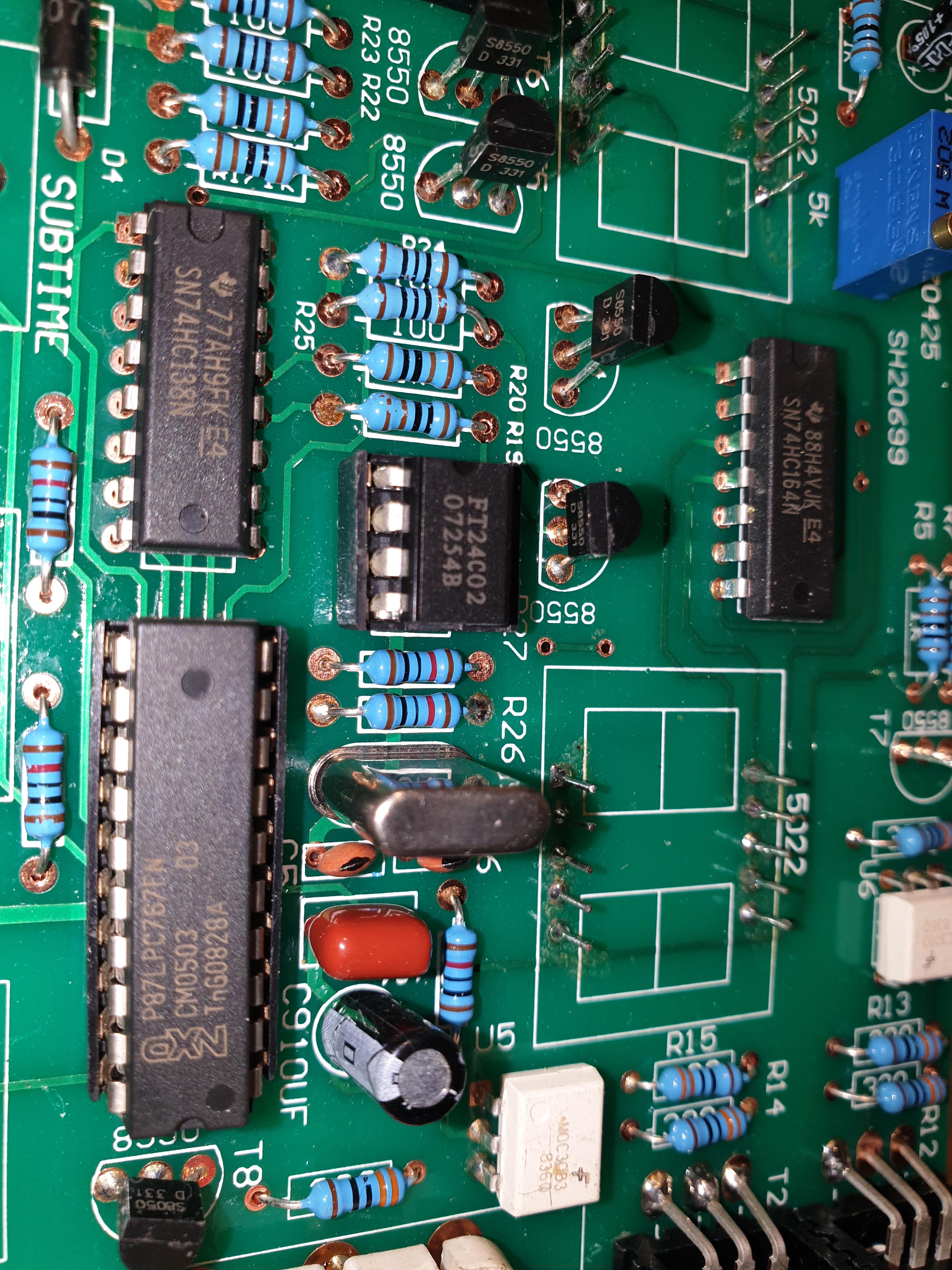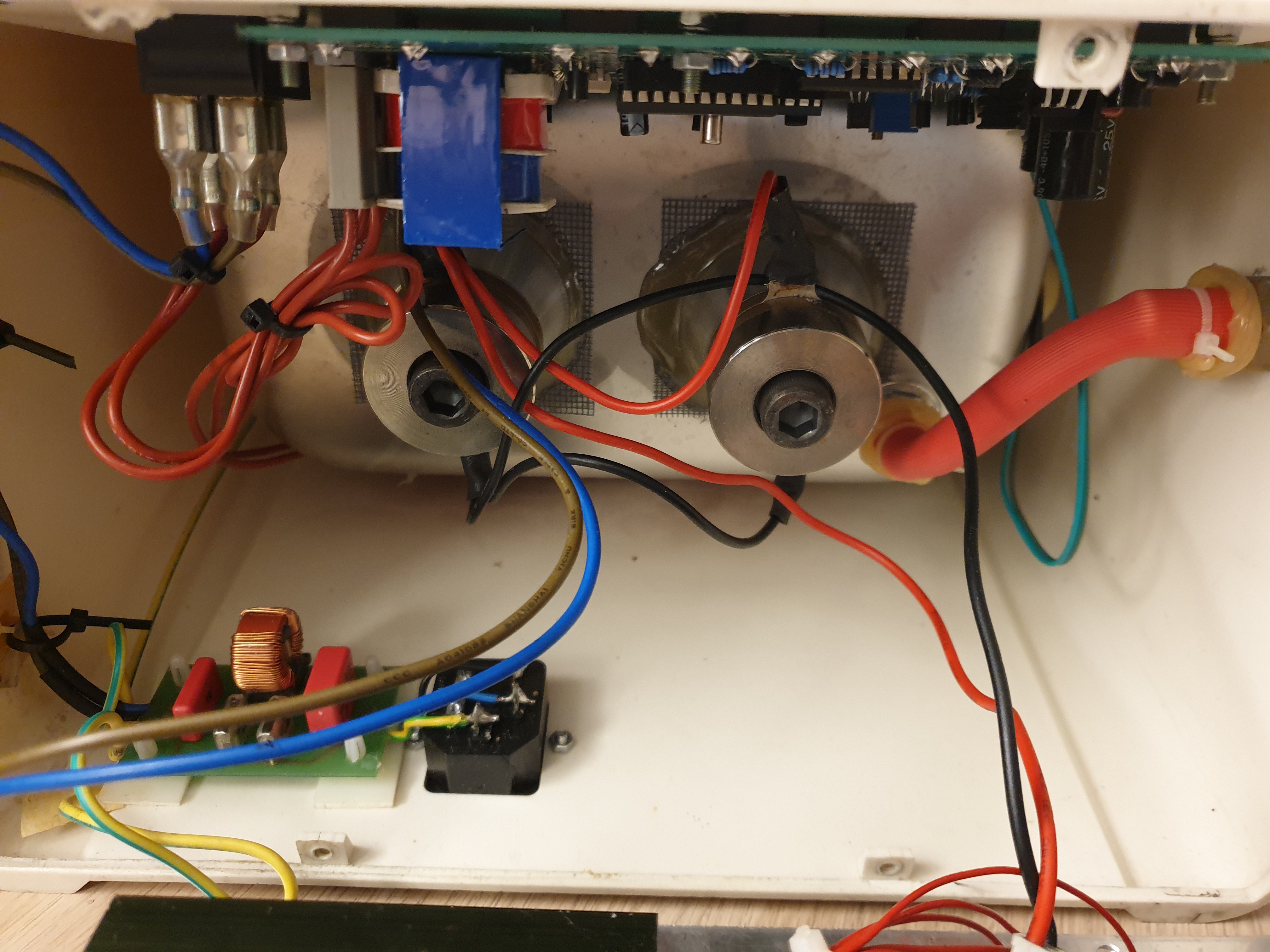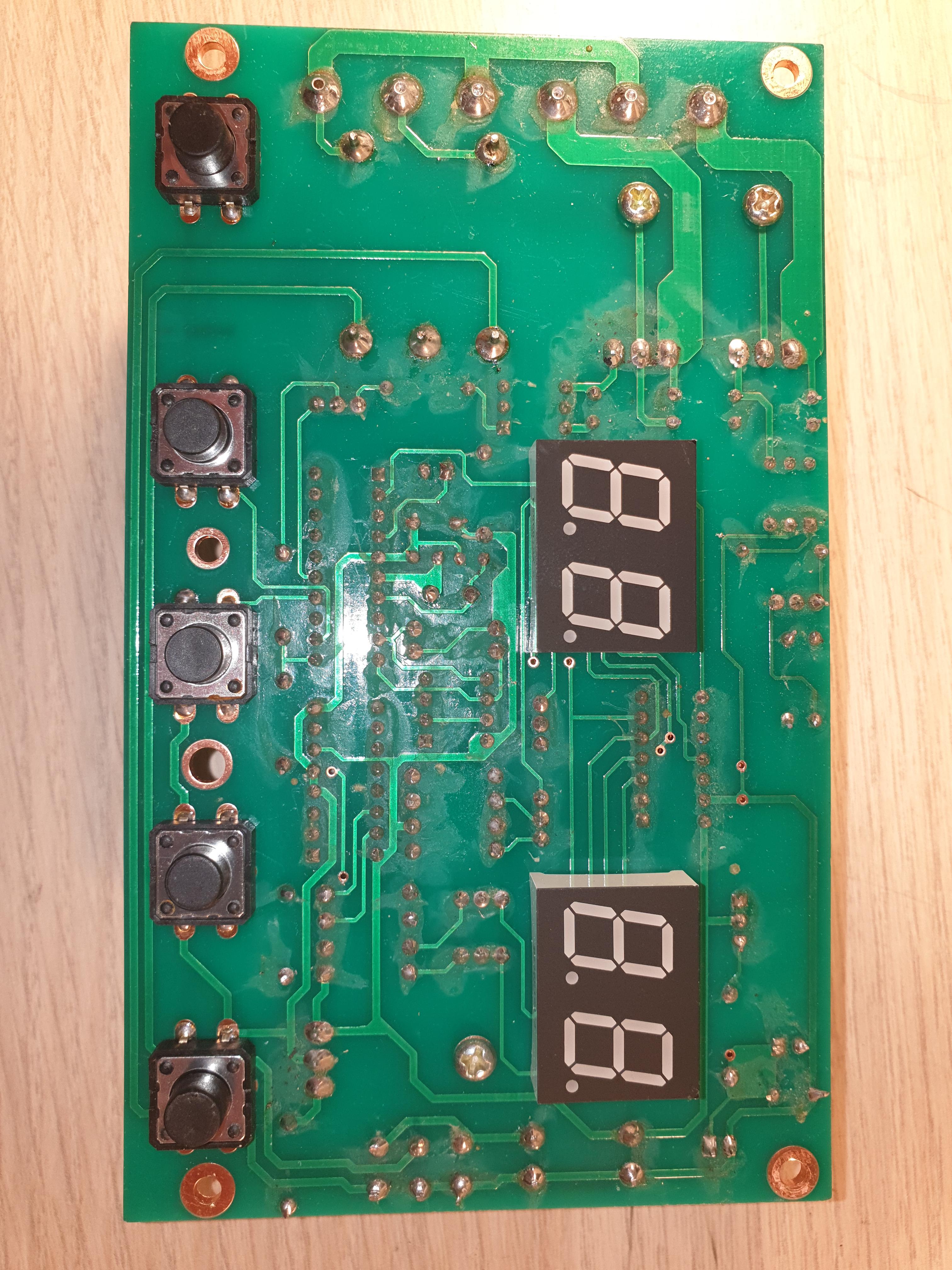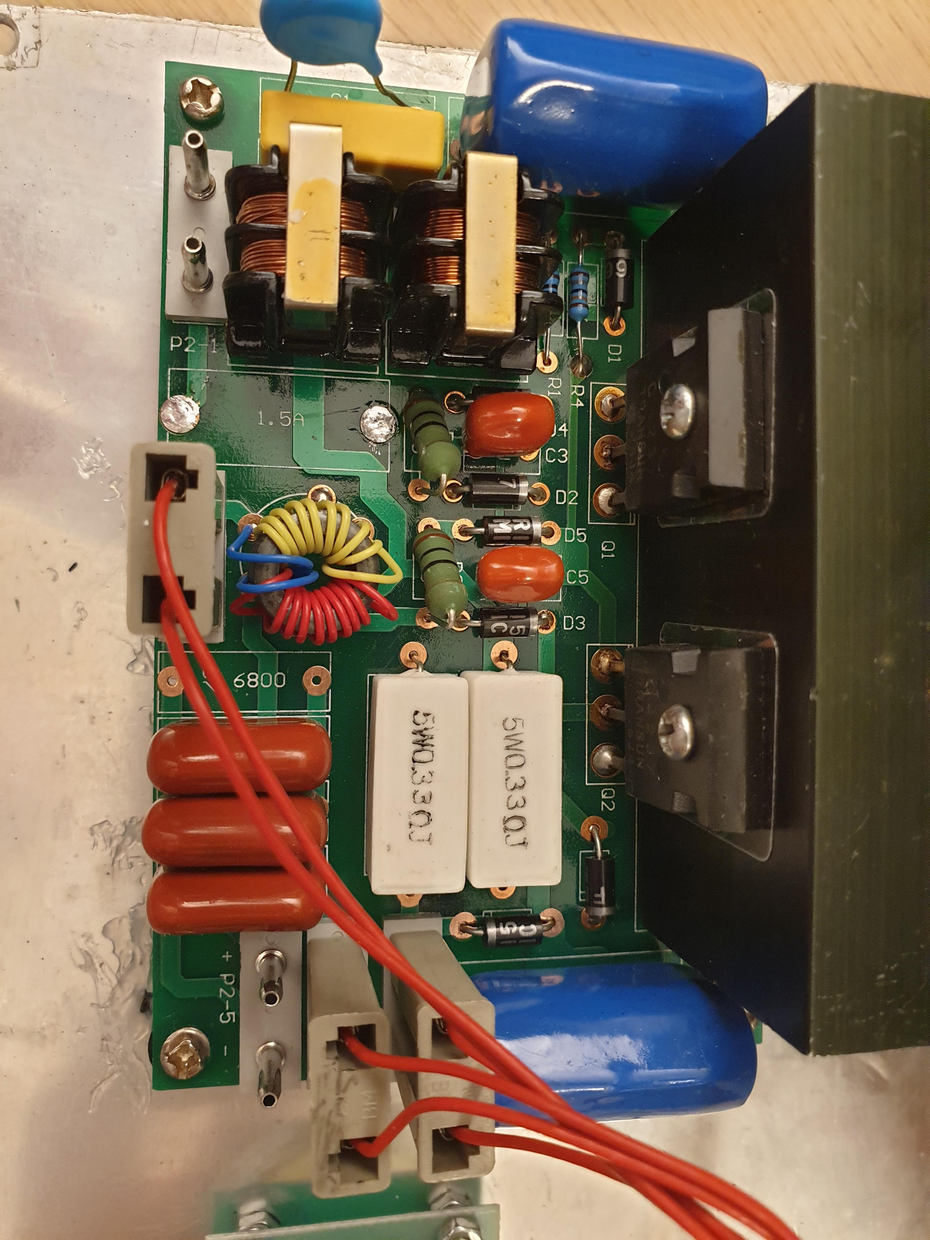 Dzisiaj rozkręciłem i okazało się, że płytka z przetwornicą była grzebana. Wszystkie luty były poprawiane, a w miejscu bezpiecznika był wlutowany rezystor 5 W, 5,1 Ohm, rezystor był przepalony. W pierwszym momencie nie zauważyłem, że powinien być tam bezpiecznik i wstawiłem dwa rezystory 5 W, 10 Ohm połączone równolegle. Spaliły się natychmiast po załączeniu przetwornicy.