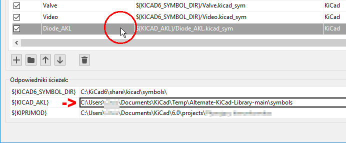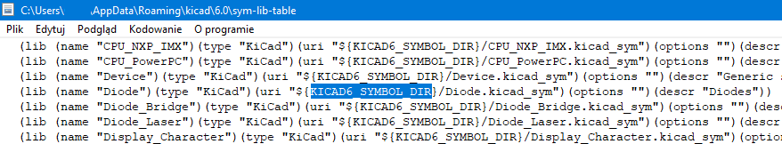A teraz do rzeczy. W Kicad mamy konfigurację globalną i lokalną. Obie są zapisywane w pliku sym-lib-table. W moim Mac OS globalny plik sym-lib-table spoczywa sobie spokojnie w /Library/Application Support/kicad/template - tutaj mamy plik zapisany listą standardowych bibliotek symboli dostarczanych razem z Kicad. Natomiast plik konfiguracji lokalnej ukryli w ścieżce: /Users/użytkownik/Library/Preferences/kicad (i jego po prostu na początku nie ma). Wystarczy skopiować ten plik z pierwszej lokalizacji do drugiej i gotowe. Przy okazji warto też skopiować konfigurację footprintów zapisaną w pliku o nazwie fp-lib-table.