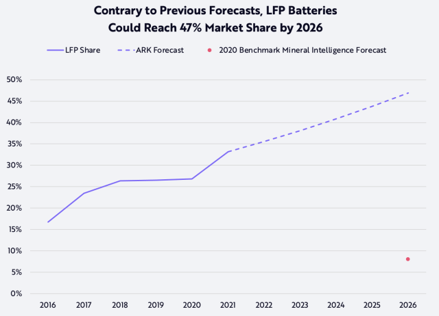 Wśród wielu dostępnych prognoz, raport ARK Investment Management LLC zakłada, że udział w rynku tańszych akumulatorów LFP wzrośnie z około 33% w 2021 roku do około 47% do 2026 roku.