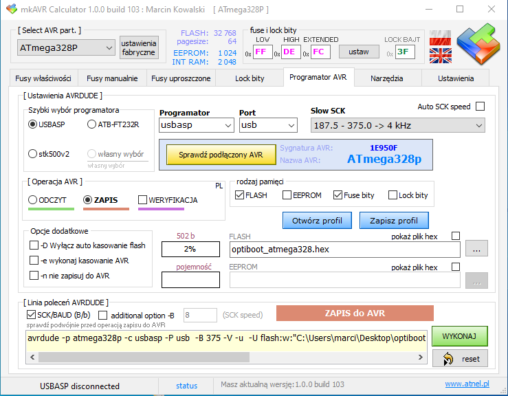 2. Programowanie przez MkAVR Calculator na domyślnej konfiguracji MCU (62 D9 FF) i usbasp zajmuje wieki (ponad pięć minut) niezależnie od wielkości wsadu. Posiadam dwa programatory z różnymi wersjami firmware i problem dotyczy obydwu, jak i wszystkich podłączonych mikrokontrolerów. Reset konfiguracji programu poprzez usunięcie kluczy rejestru nie pomógł. Używany avrdude zainstalowany z programu.