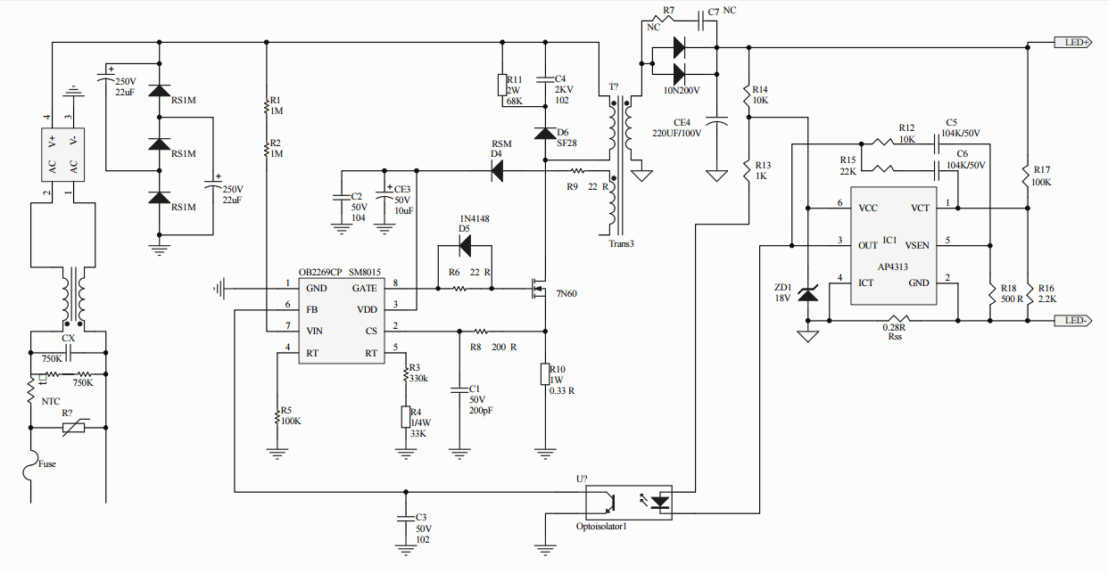 Dokładnego opisu działania zasilacza nie zamierzałem tu robić, ale i tak warto jeszcze nadmienić, że sam OB2269 początkowo jest zasilany przez swój pin VIN, poprzez rezystory o dużej rezystancji bezpośrednio z linii 325V+, natomiast po wykonaniu pierwszego cyklu (po wystartowaniu) zasila go pomocnicze uzwojenie na transformatorze. To po to jest na nim jedna dioda a dalej kondensatory już na jego VDD.