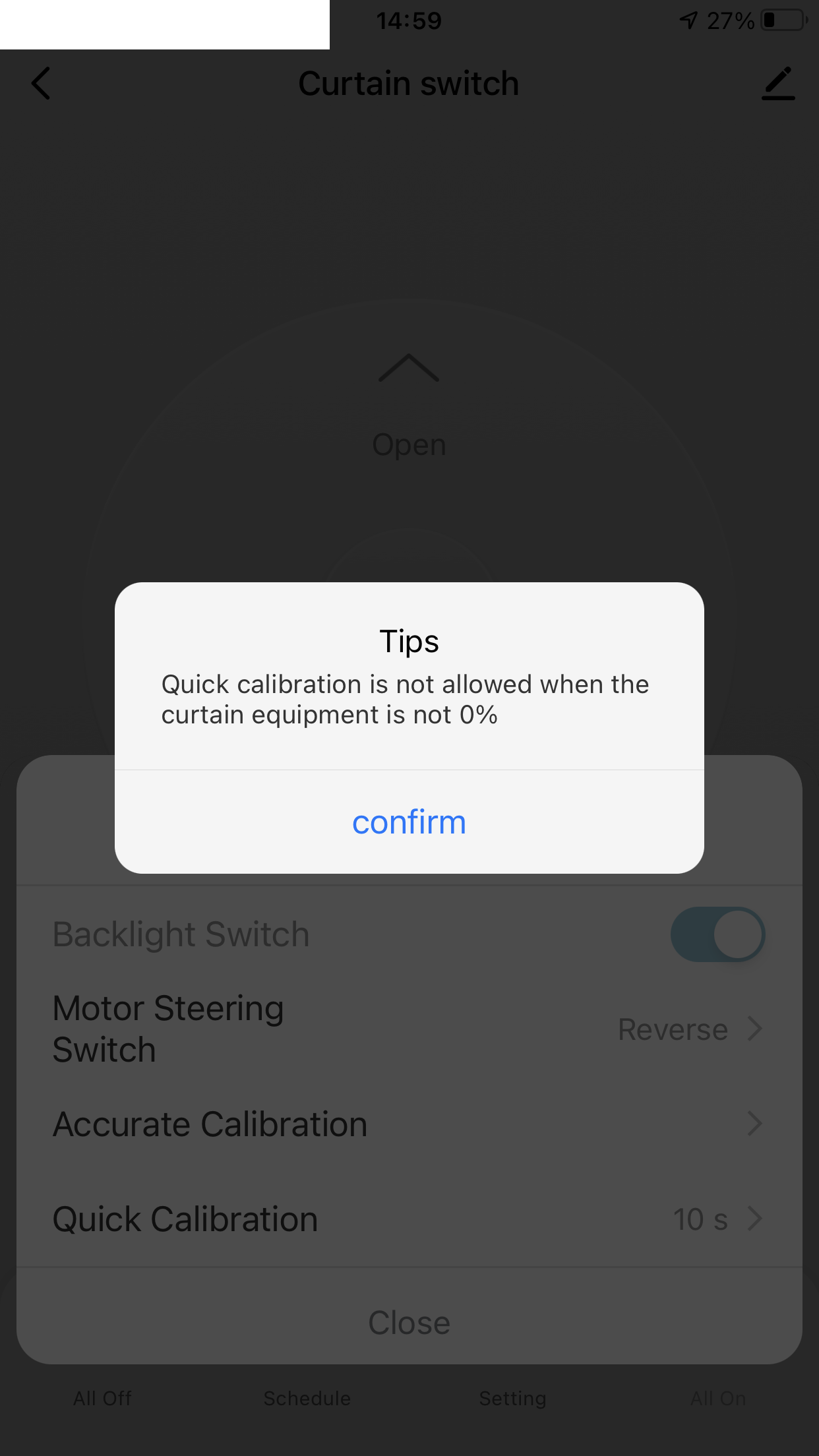 Mamy też kontrolę nad diodą LED znajdującą się na pokładzie urządzenia oraz możliwość kalibracji. Wstępna kalibracja pozwala podać czas otwierania/zamykania, a dokładniejsza zdaje się pozwala rozpocząć otwieranie/zamykanie i kliknięcie stop gdy roleta w pełni się otworzy/zamknie.