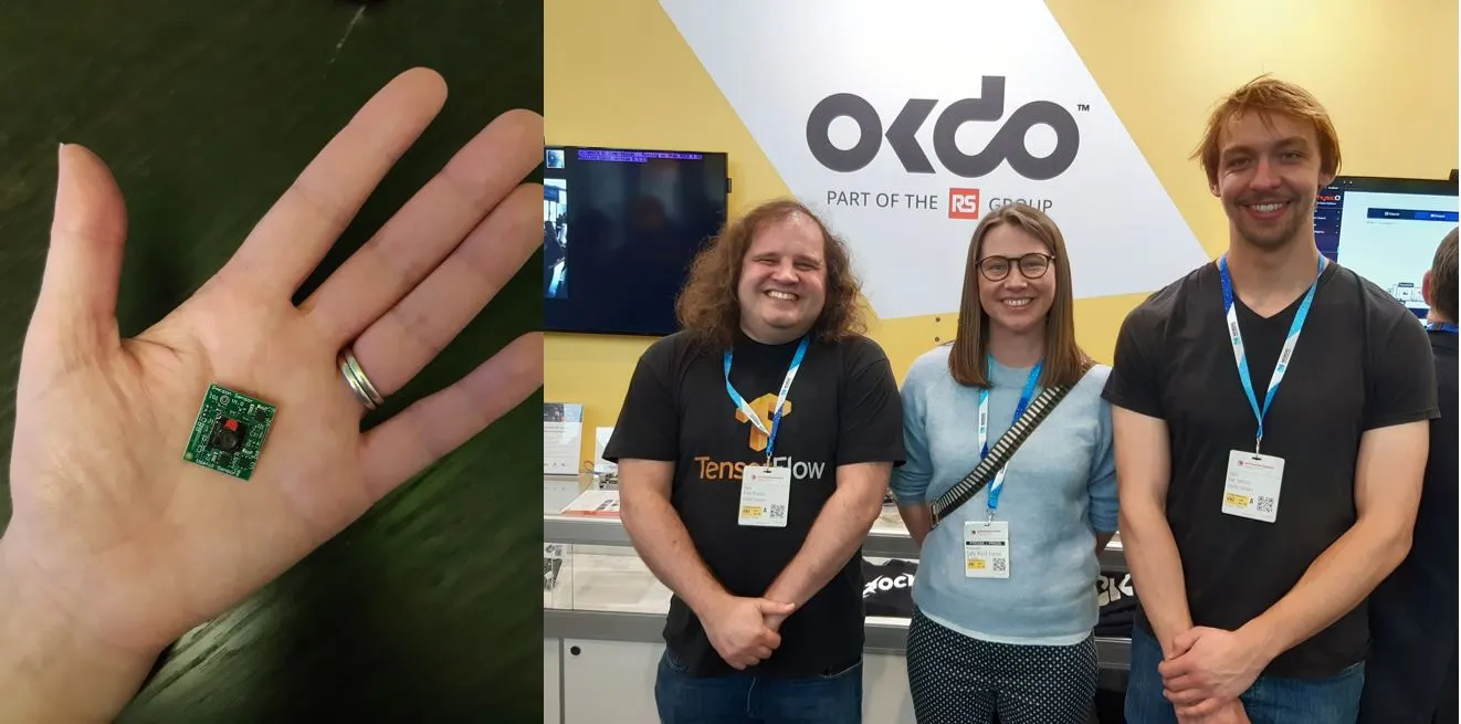 Dyrektor generalny firmy Useful Sensors, Pete Warden, i inżynier oprogramowania z tej spółki, Nat Jefferies, byli na stoisku przedsiębiorstwa OKdo, gdzie prezentowali swój moduł czujnikowy do wyłapywania obiektów wielkości znaczka pocztowego, który jest produkowany przez OKdo.