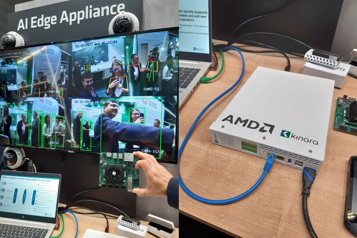 Układ Kinara pierwszej generacji — ARA-1 — został zademonstrowany na stoisku AMD. Tu porównano moduł Xilinx Kria K26, który znajdował się obok czterech jednostek Kinara w obudowie zaprojektowanej do jednoczesnego przetwarzania wielu strumieni wideo w czasie rzeczywistym. Dyrektor generalny firmy, Ravi Annavajjhala, powiedział EE Times, że chociaż przedstawiono obsługę strumieni z czterech kamer, system może zapewnić wsparcie dla ośmiu H.264 1080p.