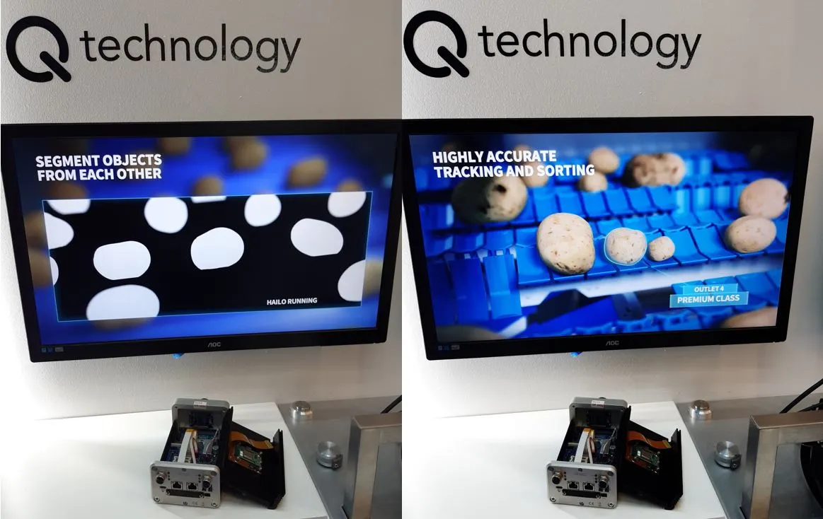 W przestrzeni ekspozycyjnej Hailo można było zobaczyć różne wersje demonstracyjne serwerów edge-AI od partnerów firmy korzystających z akceleratora Hailo-8, w tym przemysłowego systemu wizyjnego duńskiego producenta Qtechnologies, przeznaczonego do szybkiego sortowania ziemniaków. Mechanizm klasyfikował jednocześnie warzywa według wielkości, kształtu, jakości i odmiany. A demonstracja prezentowała działanie algorytmów segmentacji, śledzenia i sortowania w czasie rzeczywistym.