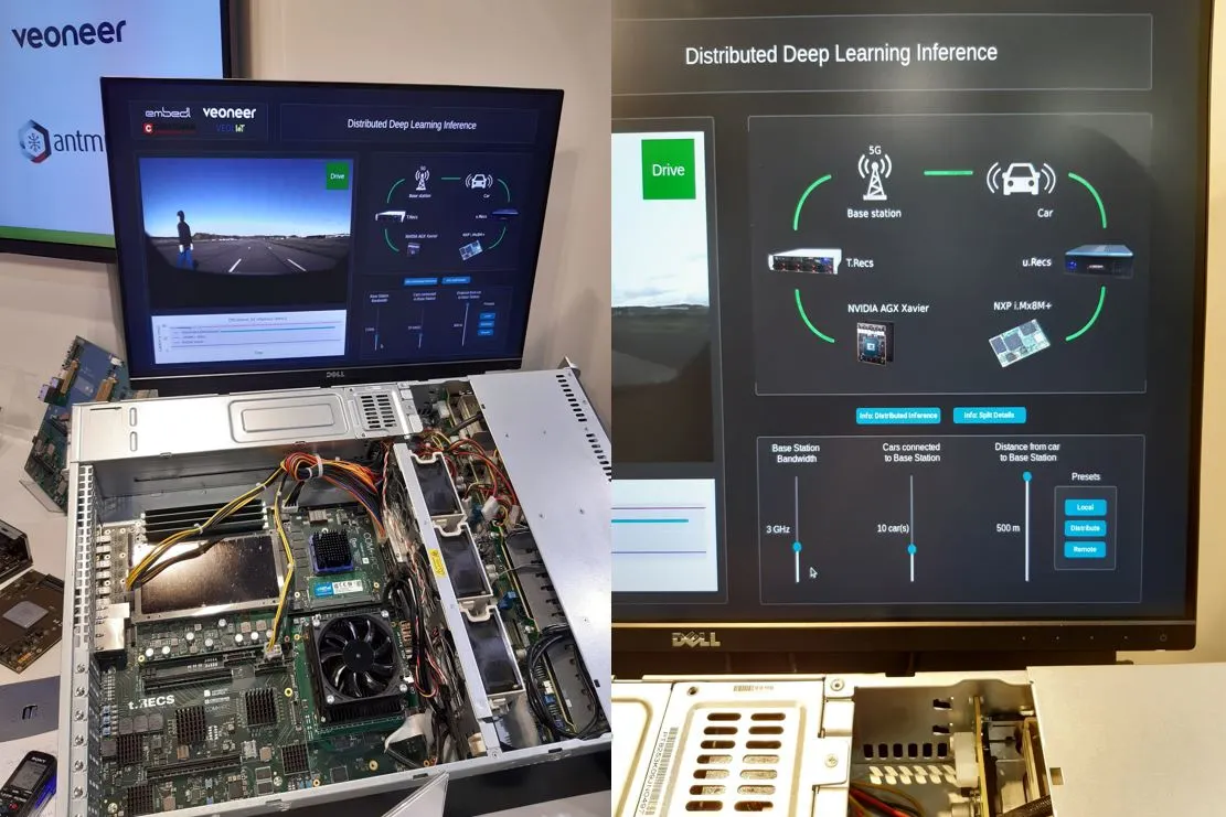Ich demo na targach prezentowało zarządzanie obciążeniami AI na różnych urządzeniach: procesorze graficznym Nvidia AGX Xavier w stacji bazowej 5G i aplikacyjnym NXP i.MX8 w samochodzie. Przy wystarczającej dostępnej przepustowości 5G: „trudne” warstwy sieci neuronowej mogą być obliczane zdalnie w stacji bazowej, a reszta w pojeździe, w celu optymalizacji opóźnień. Zmniejszenie możliwej przepustowości 5G powoduje, że większość lub całość obciążenia zostanie przeniesiona do układu i.MX8 w sposób dynamiczny. Firma Embedl zoptymalizowała ten sam model dla obu typów sprzętu.