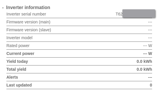 Mam problem z dogadaniem falownika z dostarczonym wraz z nim modułem WiFi. Teoretycznie wszystko powinno działać "od razu". Diody na module świecą tak jak mają przy normalnej pracy (najważniejsza dioda: COM -- świeci). Mimo tego na stronie modułu nie widać żadnych danych poza nr seryjnym falownika. W aplikacji widnieje jako "offline". Tak to wygląda na wspomnianej stronie: