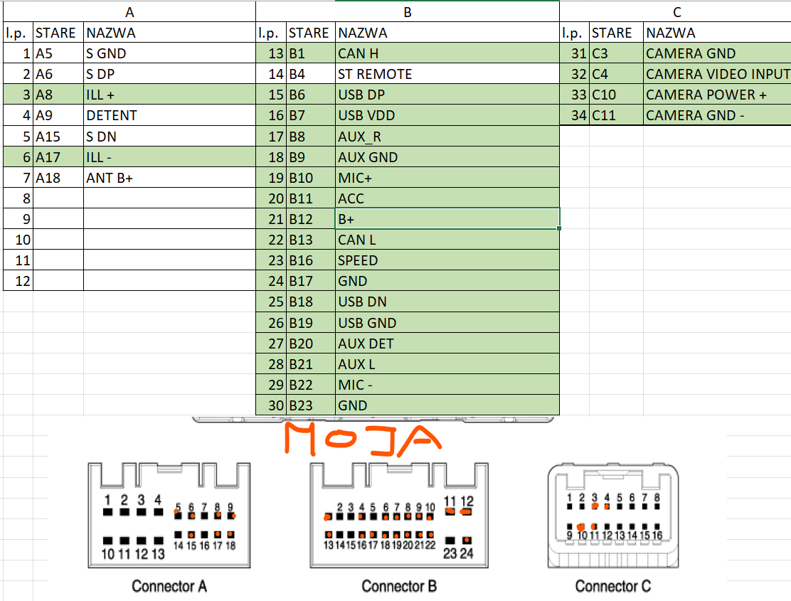 Oryginalna wtyczka nie posiada wyjść (przewodów prowadzonych od radia) do głośników, a sygnał prawdopodobnie wysyłany jest do wzmacniacza w komunikacji szeregowej. Wtyczka oryginalna posiada następujące wyjścia pinów. Te, które udało mi się zidentyfikować zaznaczone są w tabeli kolorem zielonym. Czerwonymi kropkami zaznaczone są wyjścia na wtyczce, które posiadają oryginalny przewód.