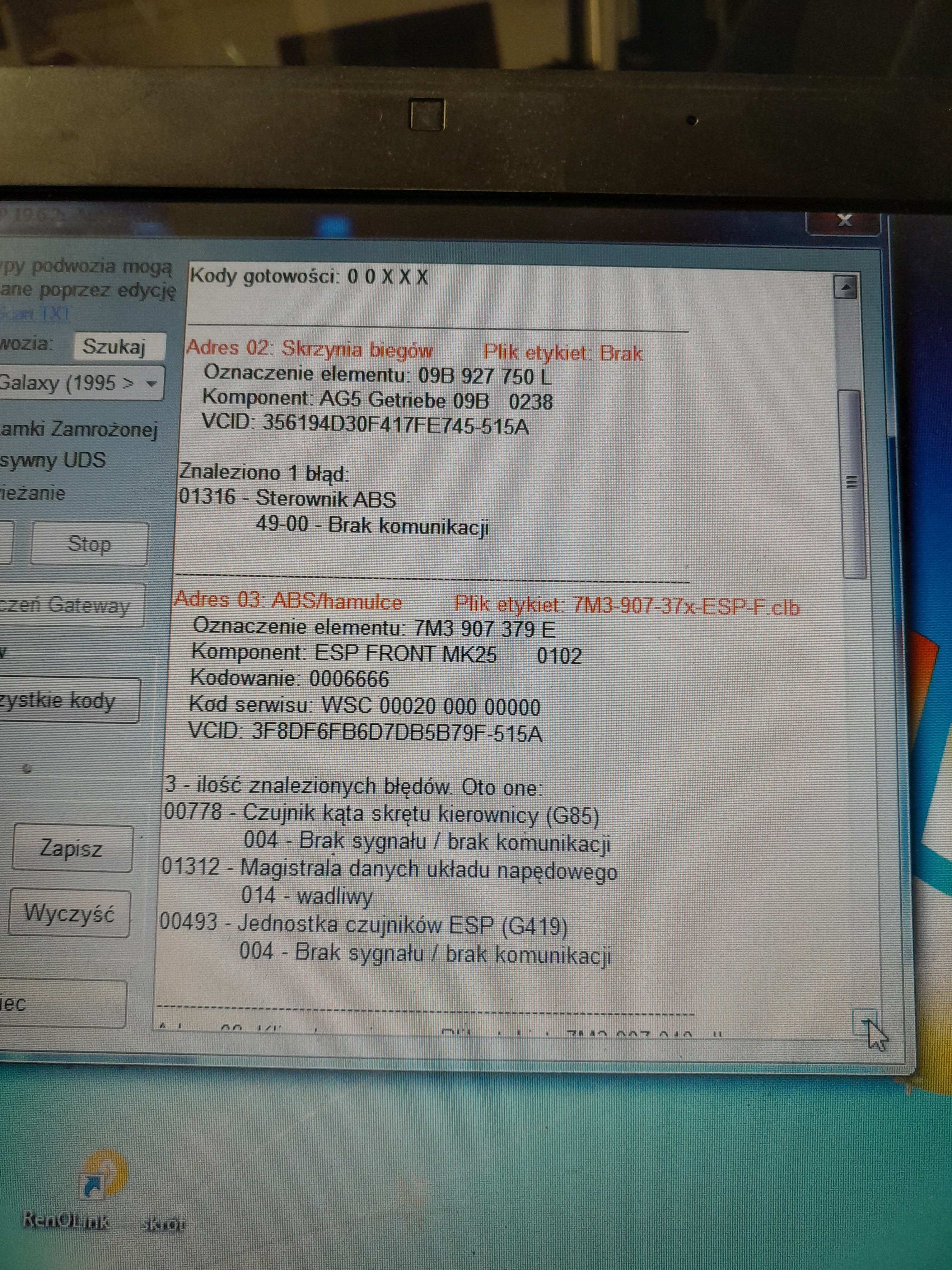 Jak w temacie galaxy 2003 rok 1.9 tdi 85kW świecą się kontrolki ABS ESP i wykrzyknik od ręcznego . błędy jak na załączniku . Sprawdzona wiązka od czujnika g419 do pompy abs i ciągłość przewodów jest . ( zasilanie, masa, 2 x can - sumarycznie 5v ) . Brak komunikacji skrzyni biegów automatycznej z ABS . Po wykasowaniu błędów zostaje w abs 00493 - jednostka czujników abs brak sygnału brak komunikacji - czujnik podmieniony na inny używany więc 100% pewności brak . Może miał ktoś podobny przypadek . Zastanawim się nad pompą abs cy nie jest uszkodzona . Może ja czegoś tu nie dostrzgam .