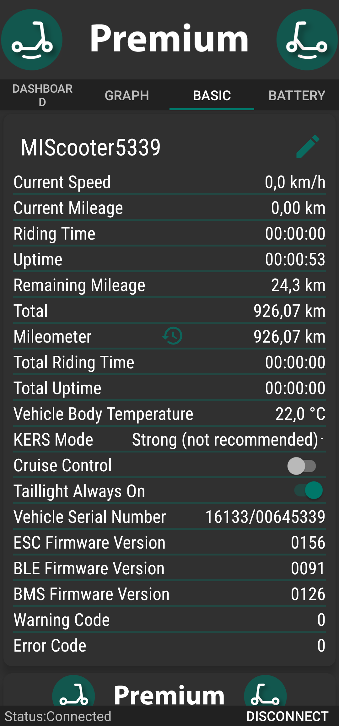 Dane techniczne hulajnogi wyciągnięte z aplikacji m365 Tools: