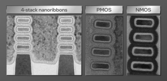 Architektura tranzystorów RibbonFET GAA składa się z czterech nanowstążek wykorzystanych, aby osiągnąć ten sam prąd sterowania co wiele 'żeber', ale na niewielkiej powierzchni.