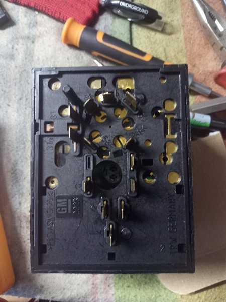 Rozebrałem włącznik świateł pozycyjnych/mijania i pomierzyłem rezystory (zdjęcie), pomiędzy punktami zaznaczonymi na zielono rezystancja wynosi 30 Ohm (obstawiam że to obwód żarówki podświetlenia). Nie wiem czym są te elementy z 3ma wyprowadzeniami.