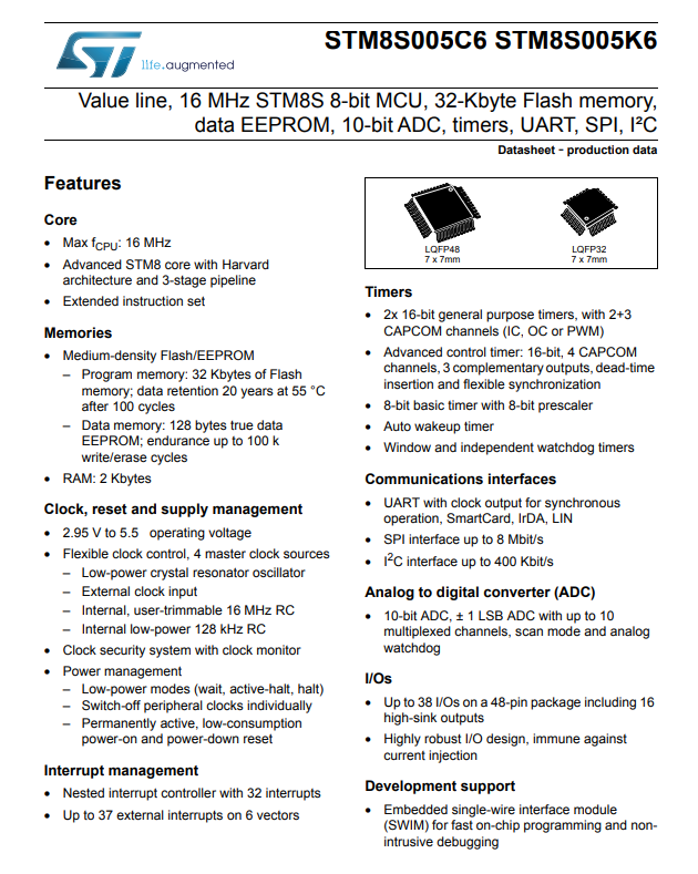 STM8S005K6T6C, 16 MHz STM8S 8-bitowy mikrokontroler z 32KB Flash, peryferiami obejmującymi UART, SPI, I2C.