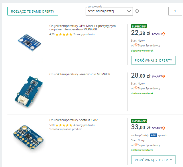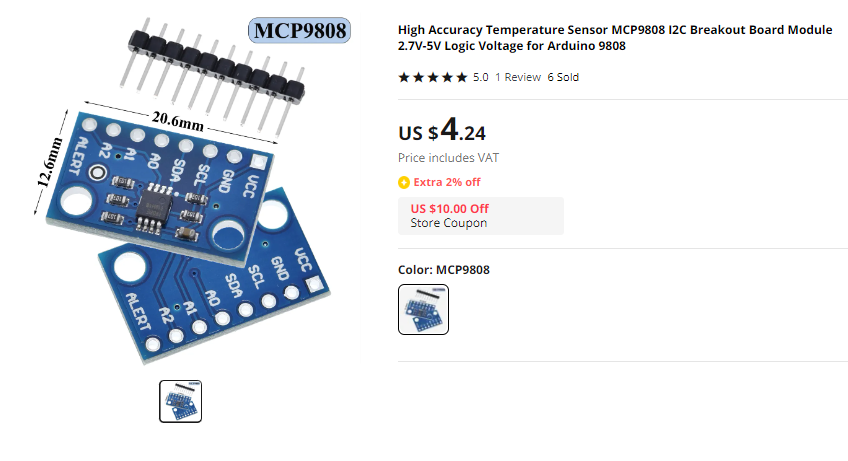 Gotowy moduł MCP9808 można kupić w wielu sklepach internetowych. W Chinach znalazłem go za około 20 zł z darmową przesyłką: