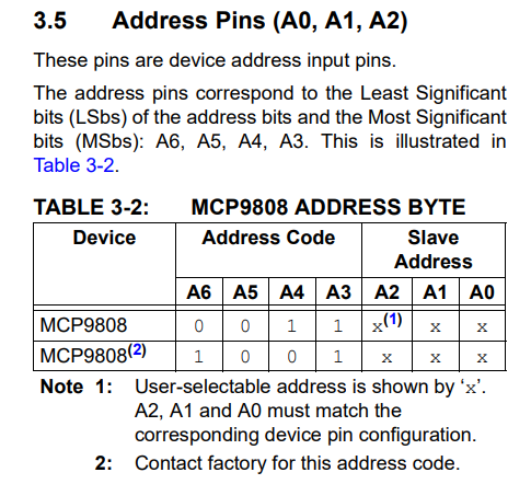 MCP9808 korzysta z protokołu I2C, co oznacza, że możemy podłączyć wiele tego typu urządzeń na jednej magistrali. Adres urządzenia możemy w pewnym zakresie zmieniać, a dokładniej możemy przestawiać trzy z jego bitów. Stan niski na A0 oznacza zgaszony bit A0, a wysoki oznacza zapalony. Poniższy fragment noty katalogowej pokazuje, jak określić właśnie ten adres: