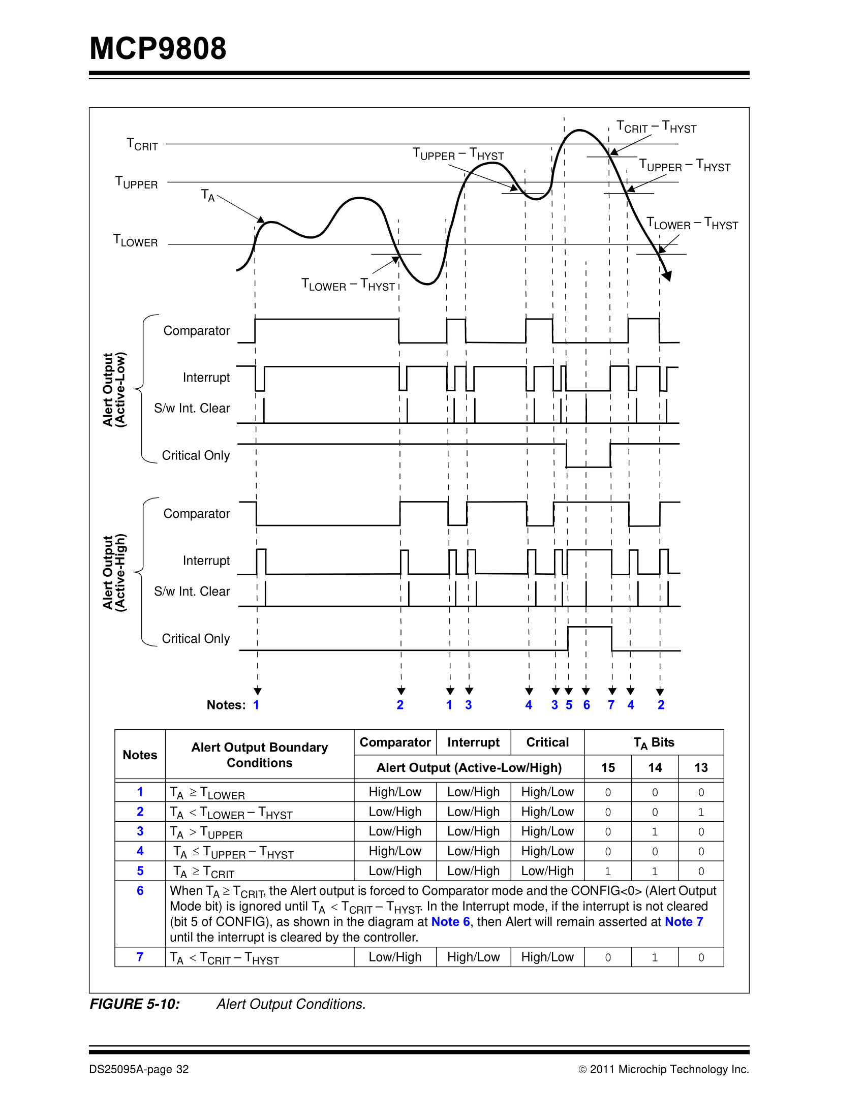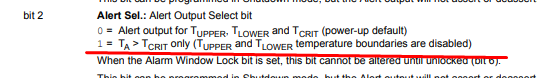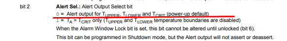 Powyższy rysunek obrazuje wszystkie dostępne tryby alarmu MCP9808. Dostępny jest zarówno tryb alarmu przy wyjściu poza zakres (Tupper i Tlower), jak i tryb alarmu przy przekroczeniu danej wartości (Tcrit). Dodatkowo widzimy tutaj podział na tryb komparatora (wartość na ALERT odzwierciedla przynależność temperatury do oczekiwanego zakresu) oraz tryb przerwania (wartość na Alert tylko chwilowo się pojawia gdy nastąpi zmiana).