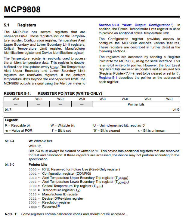 Odczyt temperatury z MCP9808 nie jest taki prosty jak w przypadku np. mojego ulubionego TC74, gdzie wystarczy odebrać jeden bajt z magistrali. Tutaj należy wykonać odczyt dwóch bajtów z danego rejestru. Najpierw wysyłamy adres tego rejestru. Przypominam dostępne adresy: