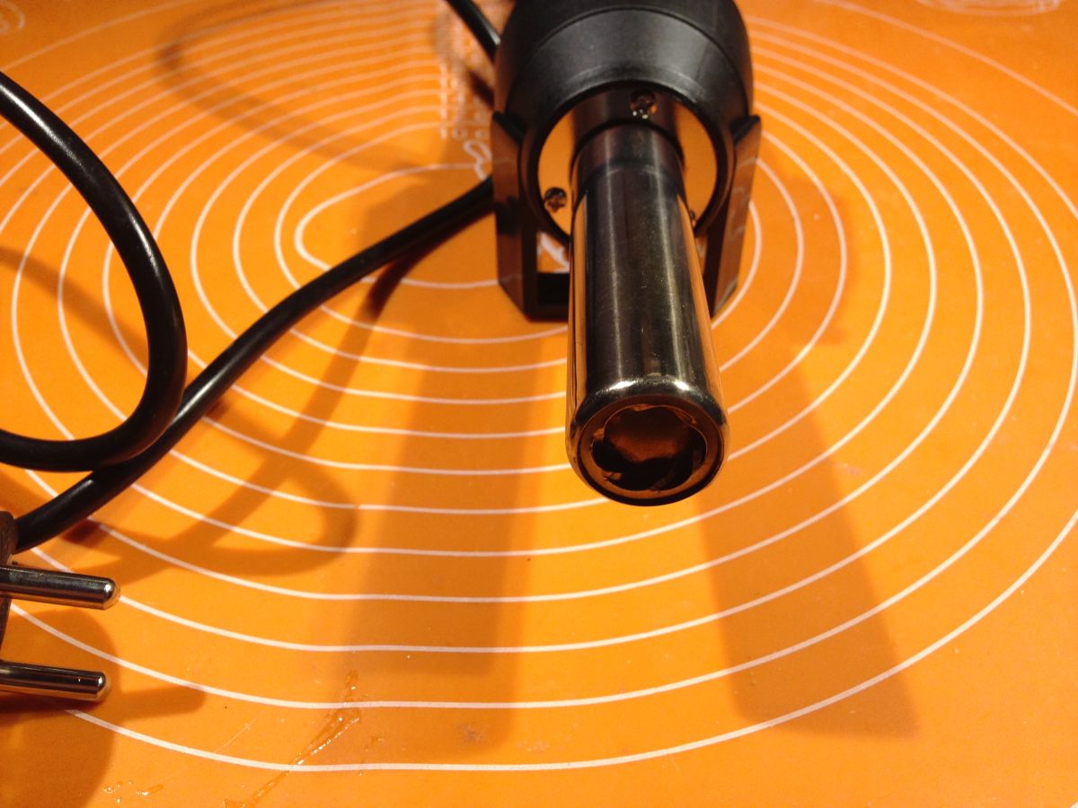 Kolba na gorące powietrze... Nie trzeba chyba tłumaczyć po co jej się stosuje, do czego i jakie są z niej korzyści. Przypomnę więc tylko, że znacznie upraszcza serwis w wypadku konieczności wymiany elementu (ów) SMD. Pozwala na miejscowe nagrzanie płytki do temperatury stopienia się spoiwa lutowniczego, usunięcie uszkodzonego elementu i montaż nowego np. na pastę lutowniczą (nie mylić z pastą ułatwiającą lutowanie! Pasta lutownicza to rodzaj zawiesiny cyny w topniku - nakłada się punktowo na pady lutownicze a po podgrzaniu do odpowiedniej temperatury cyna się topi a topnik robi swoje z napięciem powierzchniowym, co umożliwia połączenie spoiwem tylko nóżek elementu z padami - tak w uproszczeniu).