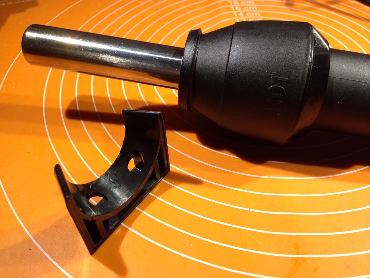 Sama kolba ma w komplecie uchwyt zakładany "na wcisk" na górną część kolby, co umożliwia proste mocowanie kolby na czas gdy nie jest nam potrzebna a także gdy musimy na chwilę mieć wolne obie ręce. Osobiście przykręciłbym ten uchwyt do krawędzi półki nad pulpitem biurka - w takiej pozycji nie byłoby bowiem żadnego ryzyka, że nagrzeję coś czego nagrzać nie powinienem, a przy tym uchwyt na tyle pewnie trzyma kolbę, ze nie ma ryzyka, ze niespodziewanie wyląduje nam na głowie... Niestety - H-A nie jest moja, a Kolegi więc nie będę tego robić, a mój H-A DiY używany jest wraz z inną stacją (też DiY) w dodatku wykorzystywany jest sporadycznie na tyle, ze nie mam potrzeby kupować drugiego - mimo, że cena (uwzględniając możliwości i wygodę operowania) jest niezwykle kusząca.