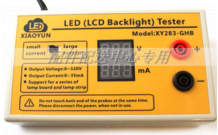 I tu ciekawostka; Według zamieszczonych na panelu górnym informacji zasilacz dostarcza dwa napięcia - jedno od 0 do 19V, a drugie od 0 do aż 300V. Nie ma natomiast widocznego żadnego przełącznika... Ponadto z informacji na panelu możemy się domyślić, że zasilacz jest zbudowany jako impulsowy (szeroki zakres napięć zasilania) i nie ma żadnej wartości max prądu... to ostatnie można zrozumieć - ostatecznie w znamienitej większości LED używane w TV do podświetlania są to diody średniej (1-3W) mocy, a więc prąd nominalny przekracza dla nich 20mA. Nie mniej jednak mamy prócz wyświetlacza ustawionego napięcia także i wyświetlany prąd płynący w obwodzie badanej listwy i jest to zawsze 20mA. Czemu? Wyjaśnienie w pierwszym filmiku, gdzie pokazałem test LED małej mocy (popularne LED mają nominalnie max 20mA) - Do sprawdzania pasków z TV wystarczy, a przy okazji nie oślepniemy podczas testów... (naprawdę te kilkanaście LED zasilanych z 20mA daje duuuuużo światła...)