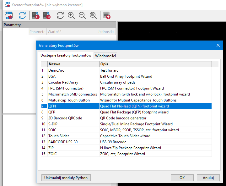 Natomiast na tym zrzucie ekranu masz kreator footprintów z całkowicie darmowego programu KiCad. Jest on mniej funkcjonalny niż ten z programu DipTrace, ale też jest to pewne ułatwienie.