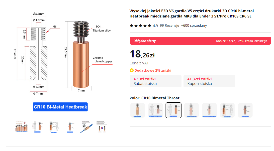 Trochę czytałem o tym, że heatbreak do CR-10 i Enderów 3 (ale nie wszystkich, bo S1 ma nieco inny) będzie pasował do fabrycznego hotenda.