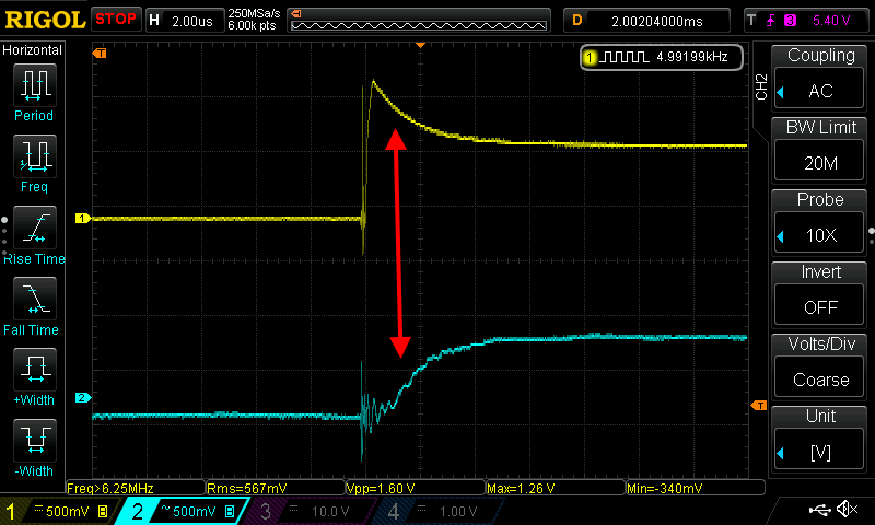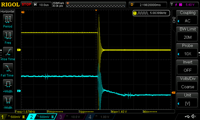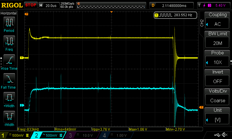 Na końcu niebieskiego przebiegu widać stopniowe opadanie napięcia gdy na rezystorze osiągnęło już stabilną wartość.